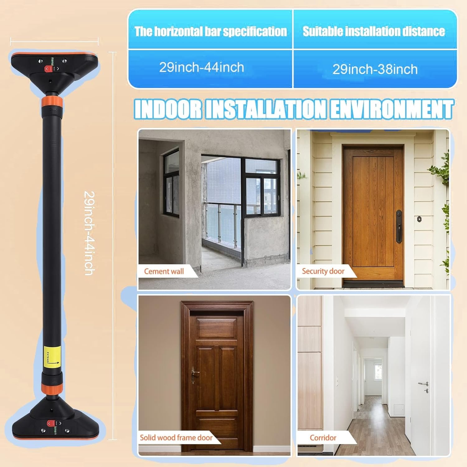 【Adjustable Width (29″-38.18″) and Universal Fit】:Fits most standard doorways (74 cm-97 cm wide)—perfect for home, garage, or office use. Works on solid wood doors, security doors, and concrete walls (not suitable for fragile/glass door frames). No tools or drilling needed!