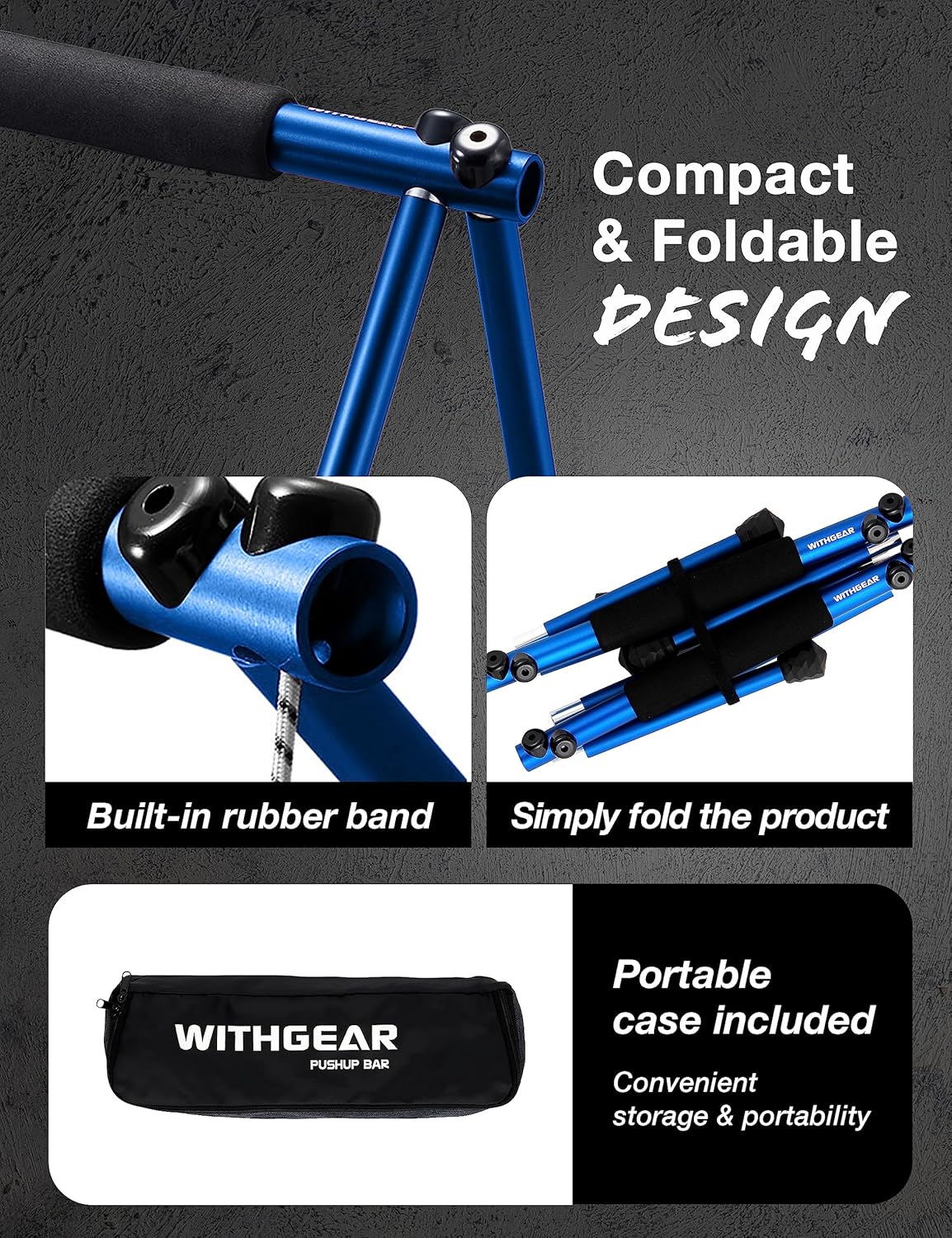 ✅ PORTABLE & LIGHTWEIGHT. Unleash your best push-ups anywhere with the WITHGEAR push up stand! Its smart folding design and easy-assembly elastic band system makes it your ultimate compact fitness companion. Turn your yard, lawn, or any indoor space into your personal at home gym!