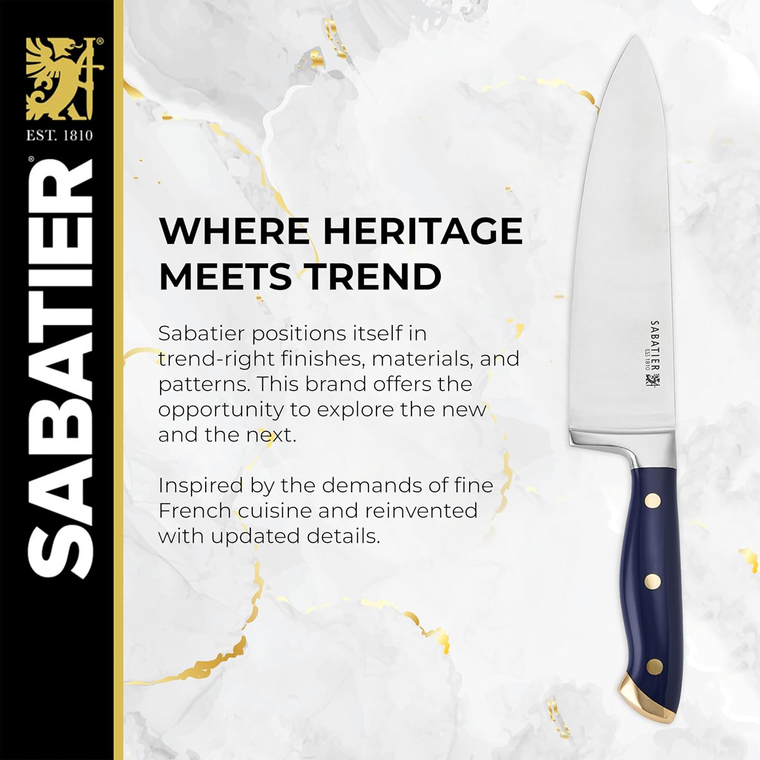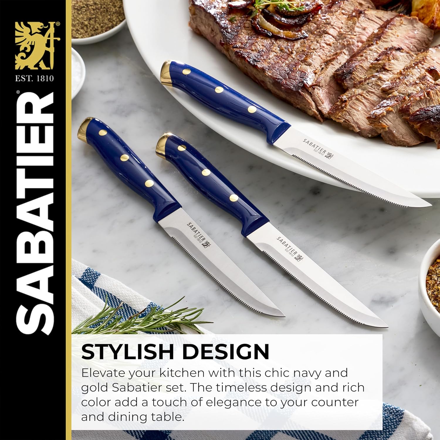 ELEVATED STYLE FOR YOUR KITCHEN: The navy handles with gold accents add a modern touch of luxury, while the acacia wood block brings timeless warmth and elegance to your countertop