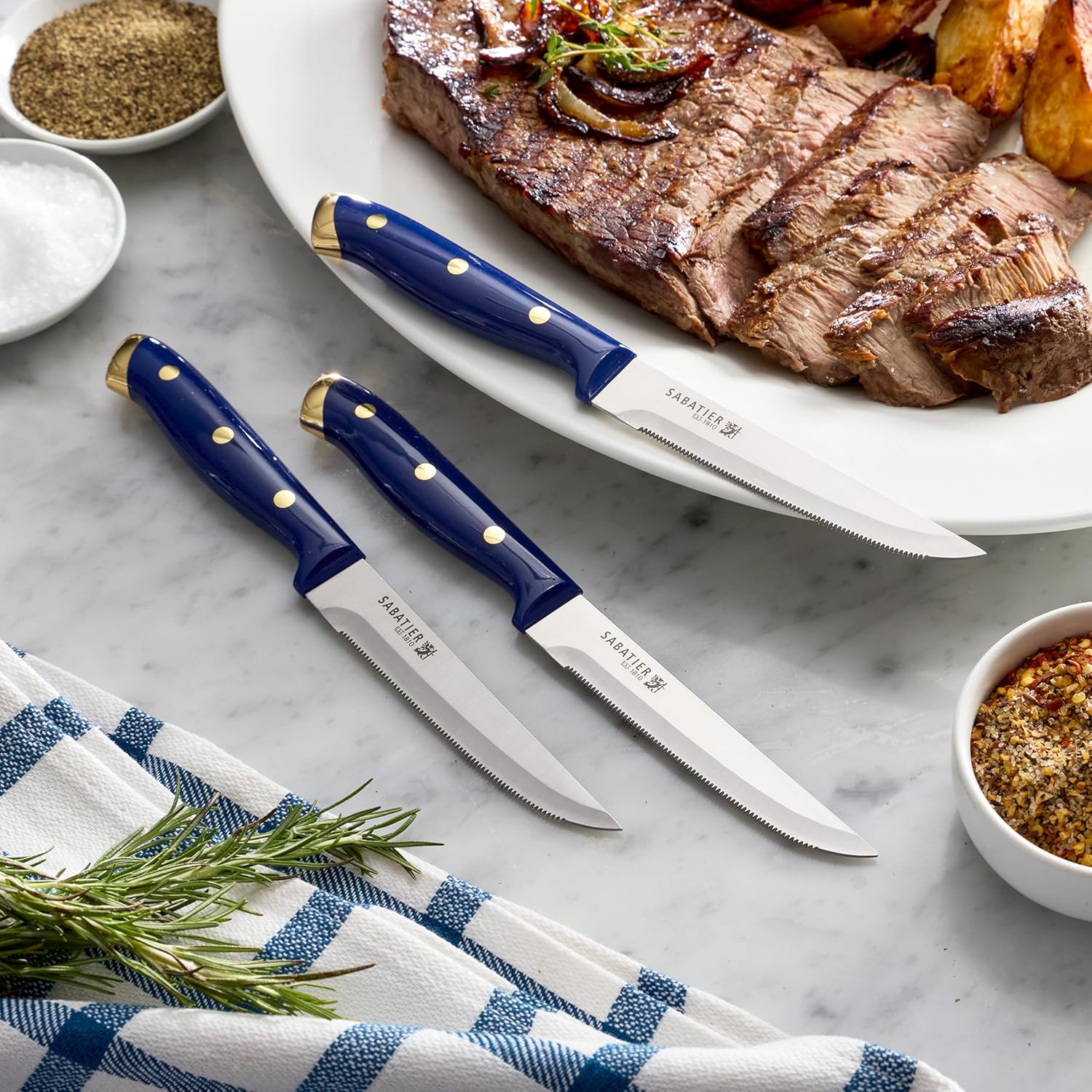 The Sabatier 14 Piece Forged Triple Rivet Knife Set with Acacia Block brings a perfect balance of elegance and performance to your kitchen. Crafted from high carbon stainless steel, each blade is precision forged for exceptional sharpness and durability, ensuring outstanding results for every culinary task. The ergonomic triple riveted handles, designed for comfort and control, are beautifully finished in navy with gold accents, adding a sophisticated touch to your space. This comprehensive set includes an 8 in chef knife, 8 in slicing knife, 5.5 in serrated utility knife, 5 in santoku knife, 4.5 in fine edge utility knife, 3.5 in paring knife, six 4.5 in steak knives, all purpose scissors, and an acacia wrapped block that keeps your knives stylishly organized.