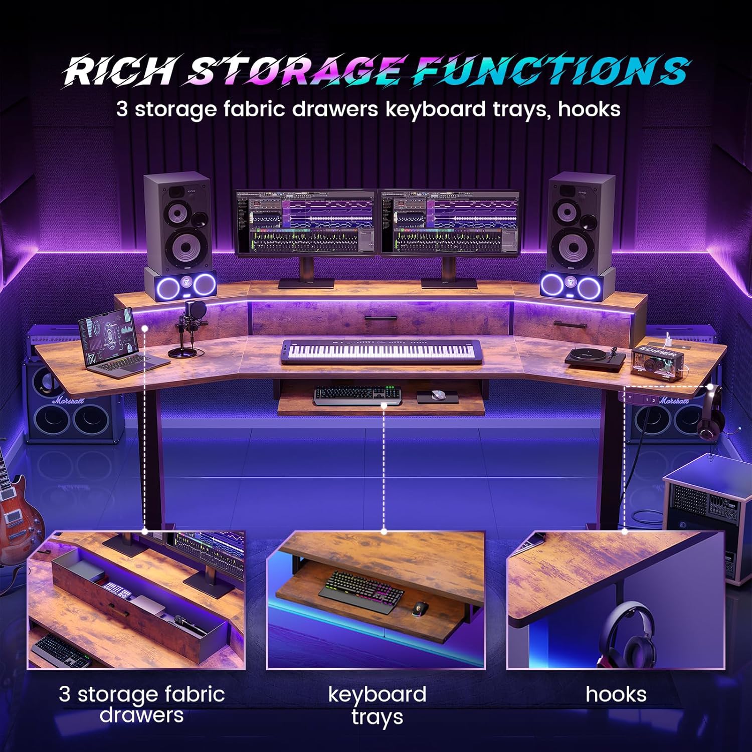 【Multifunctional Desk for Gamer】How do you make the perfect gaming station? This ergonomic gaming standing desk comes with a monitor stand, LED lights, 3 large drawers and keyboard tray. All features of this gaming standing desk provide a comfortable gaming experience and working environment. The standing gaming desk with hutch provides 3 easy to assemble fabric drawers. Drawers are made of breathable high-quality fabric, lightweight and easy to install while providing sufficient storage space.