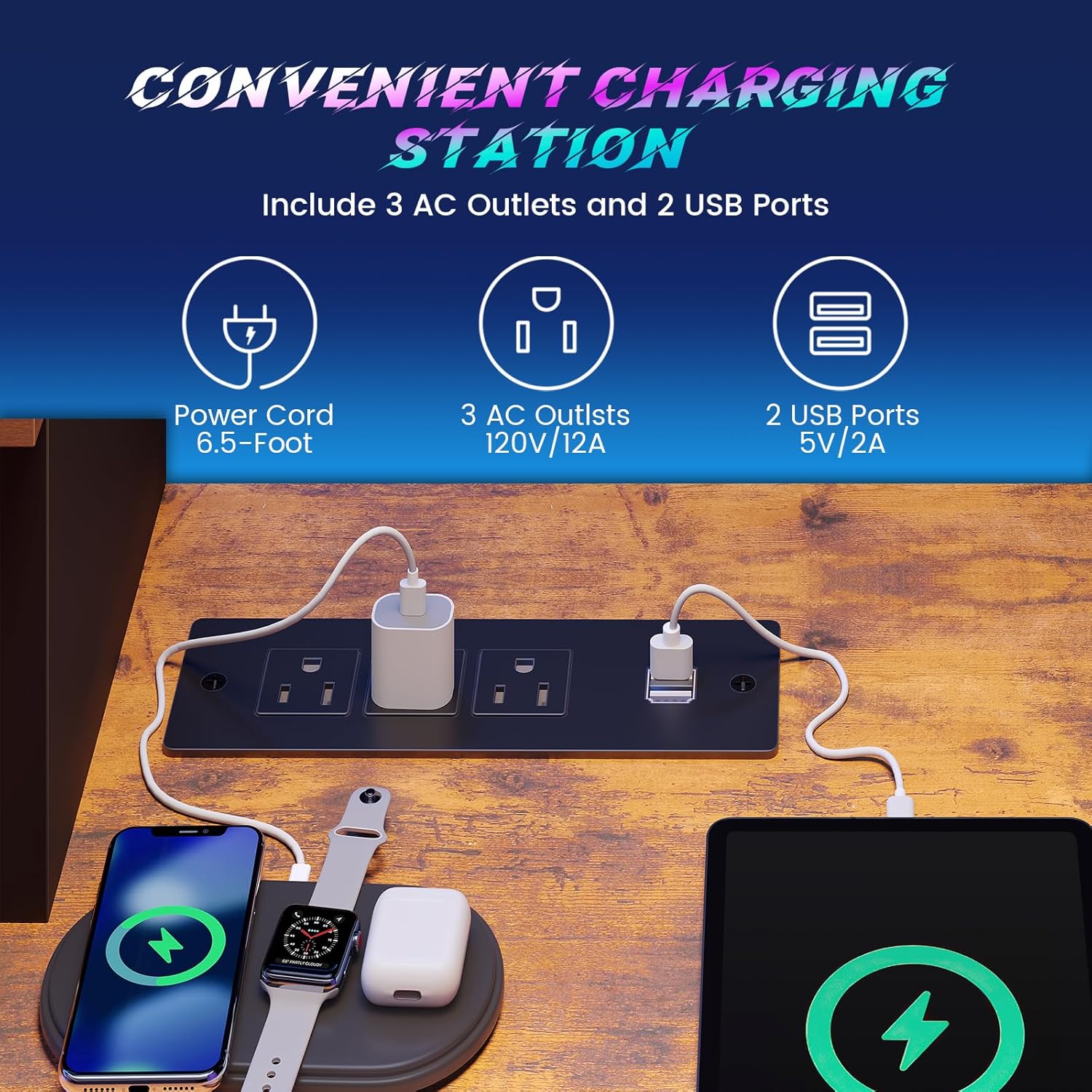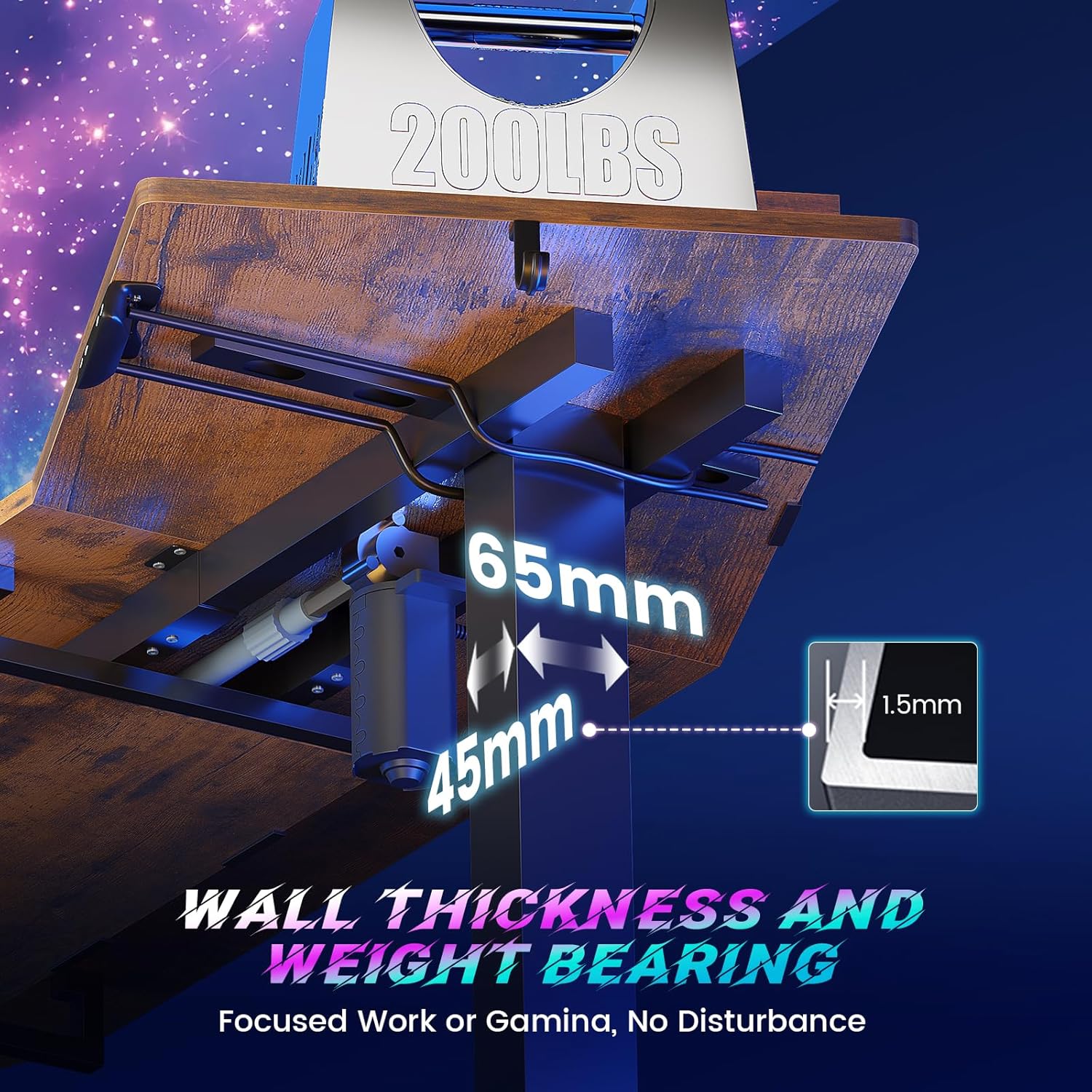 【User Friendly】The desk is made of FSC certified wood. The standing desk includes a built-in power strip with 3 outlets & 2 USB Ports provides convenience for charging your gaming gear, tablet、printer or phone.Don’t worry about not having enough power sockets. The integrated monitor stand of this PC standing gaming desk places your screens at a comfortable height in relation to your keyboard and gaming mouse, keeping you engaged in the work/game and reducing head and neck fatigue.