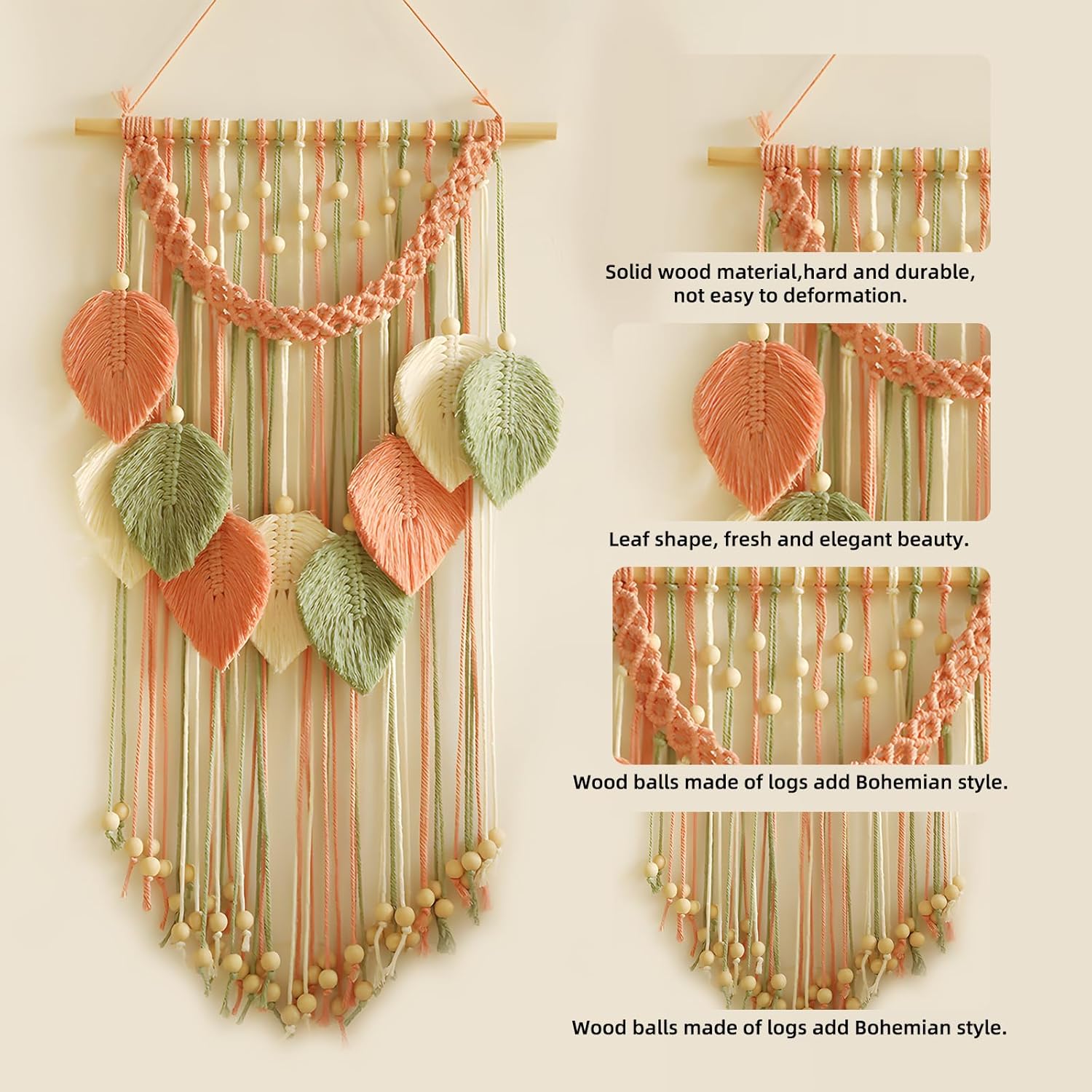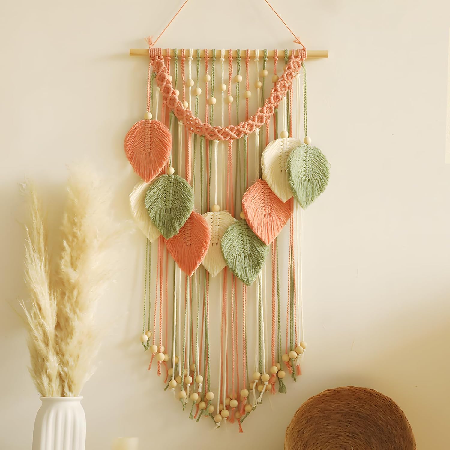 Handcrafted Bohemian Design: This macrame wall hanging showcases a stunning blend of green and pink leaves accented with wooden beads, meticulously handmade for a natural and artistic touch in any space
