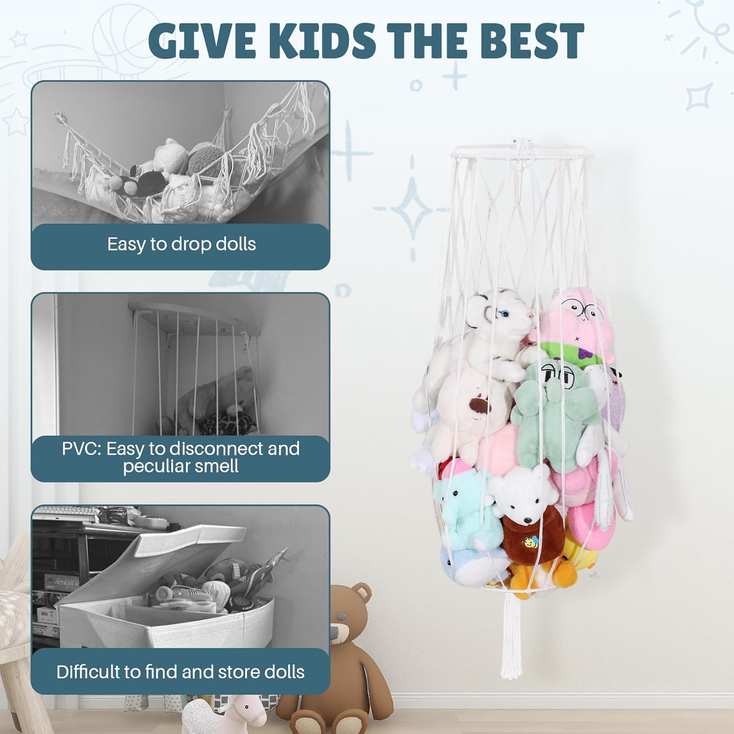 Fun Meets Stability This basketball-hoop stuffed animal hammock turns clean-up into a game. Kids can launch plush toys and watch them go into this toy storage organizer, turning any room into a mini arena. A widened, reinforced steel rim and high-density mesh offer solid support. No matter how many “players” there are, the stuffed animal net keeps the fun and the hoop strong
