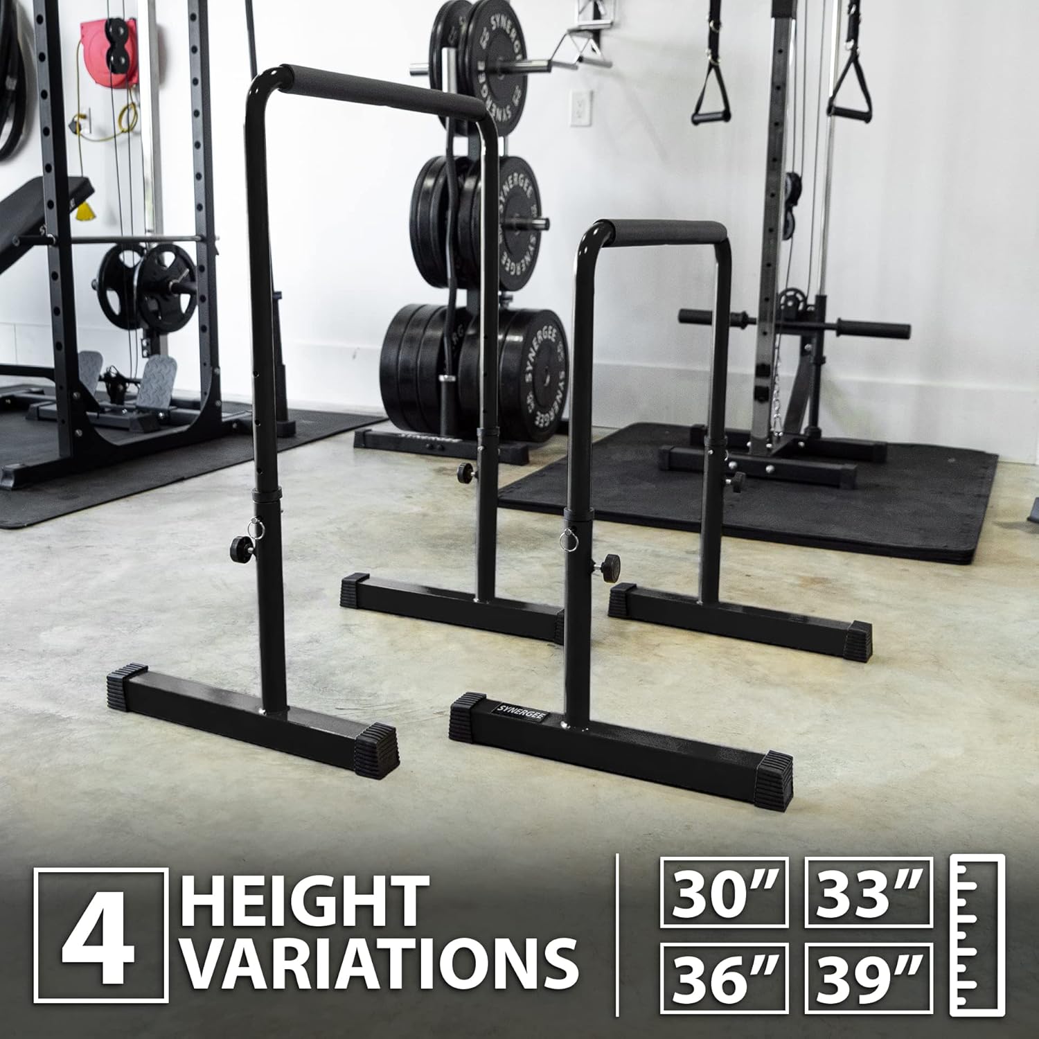 ★ WHAT’S IN THE PACKAGE ★ – Each Synergee Dip Station comes with (2) Dip Bars. Each Dip bar has a 20.5” long Base and a 24” wide Top Bar. The max capacity is 400 lbs. Dip Bars can adjusted to 4 different heights – minimum 30” and maximum 39”. This selection is for Black Dip Bars.