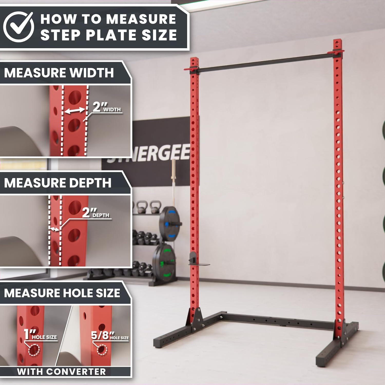 The Synergee Step Plate is the perfect add-on for your squat or power rack. Designed to help athletes comfortably reach pull-up bars, it makes your rack more accessible and versatile. Compatible with 2×2, 2×3, and 3×3 racks, the step plate comes with a converter option to fit racks with 1″ or 5/8″ holes, ensuring a secure and stable attachment. Built from 11-gauge steel with a durable powder-coated finish, it’s strong, reliable, and made to withstand repeated use.