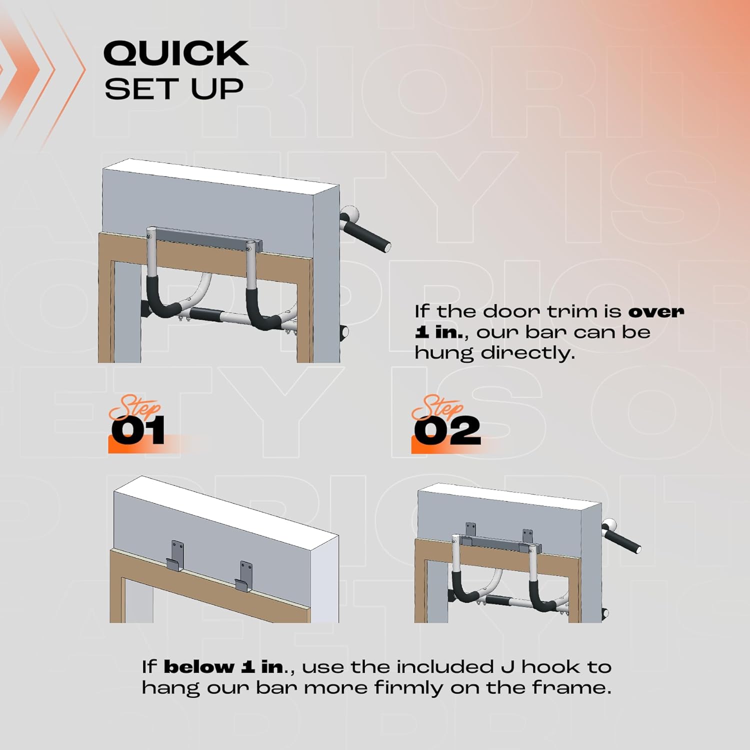 QUICK INSTALL: A home pull up bar comes with an easy-to-follow manual & all necessary tools; No screws are needed for push up bar on door trims above 13/16″, while a J-hook mount of workout bar is required for smaller trims, it’s ideal for home gym