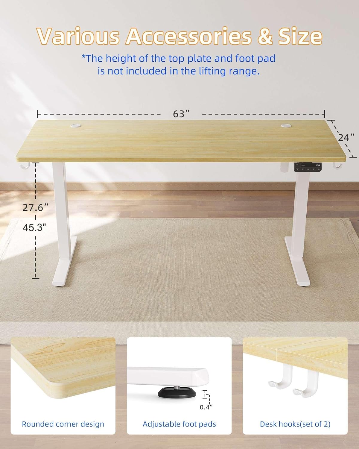 【Product Dimensions and Load Capacity】The YIHAYO electric standing desk offers a very spacious worktop, with dimensions of 63 x 24 inches.It supports up to 154 lbs, offering excellent load capacity and vertical drive power