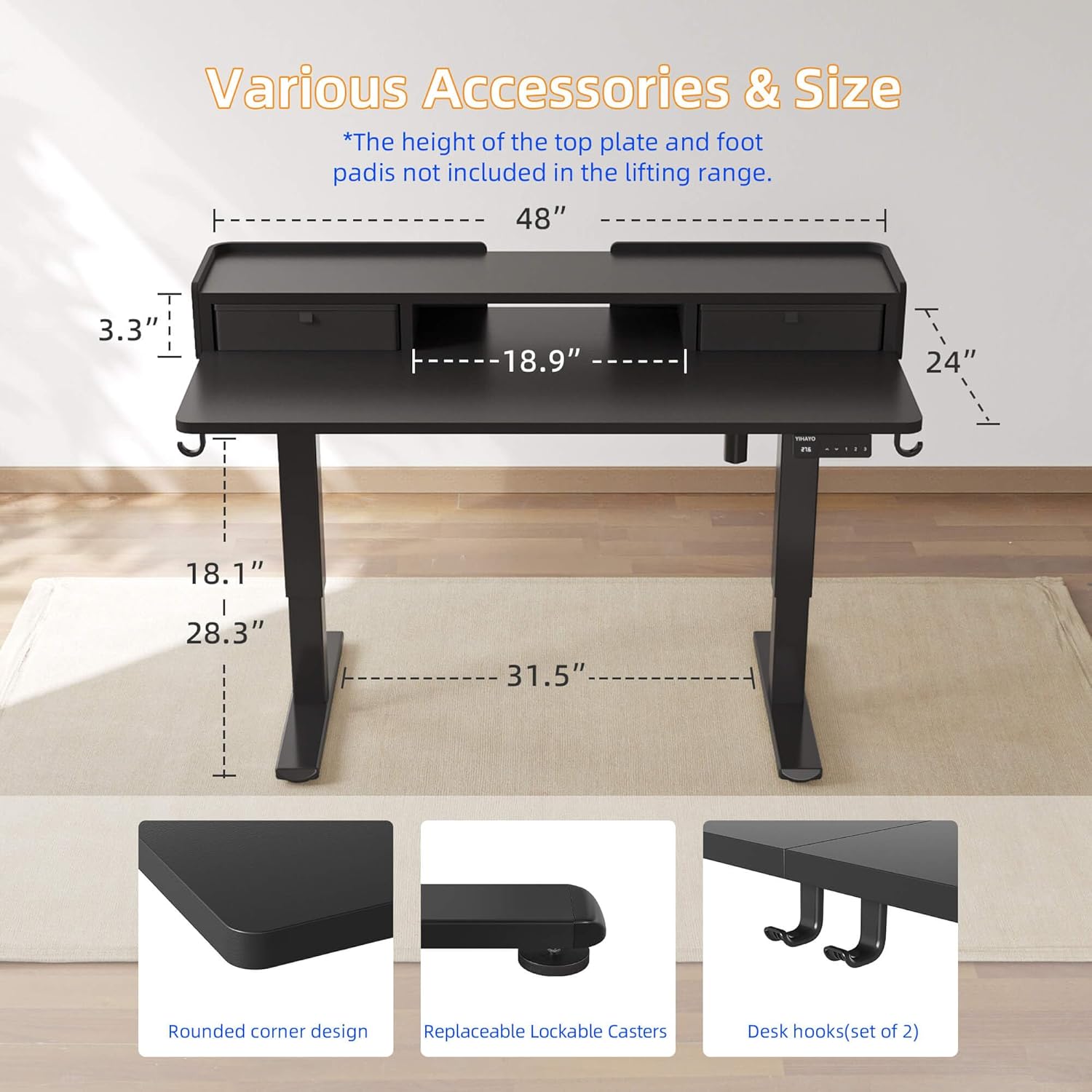 【Product Dimensions and Load Capacity】The YIHAYO electric standing desk offers a very spacious worktop, with dimensions of 48 x 24 inches.It supports up to 154 lbs, offering excellent load capacity and vertical drive power
