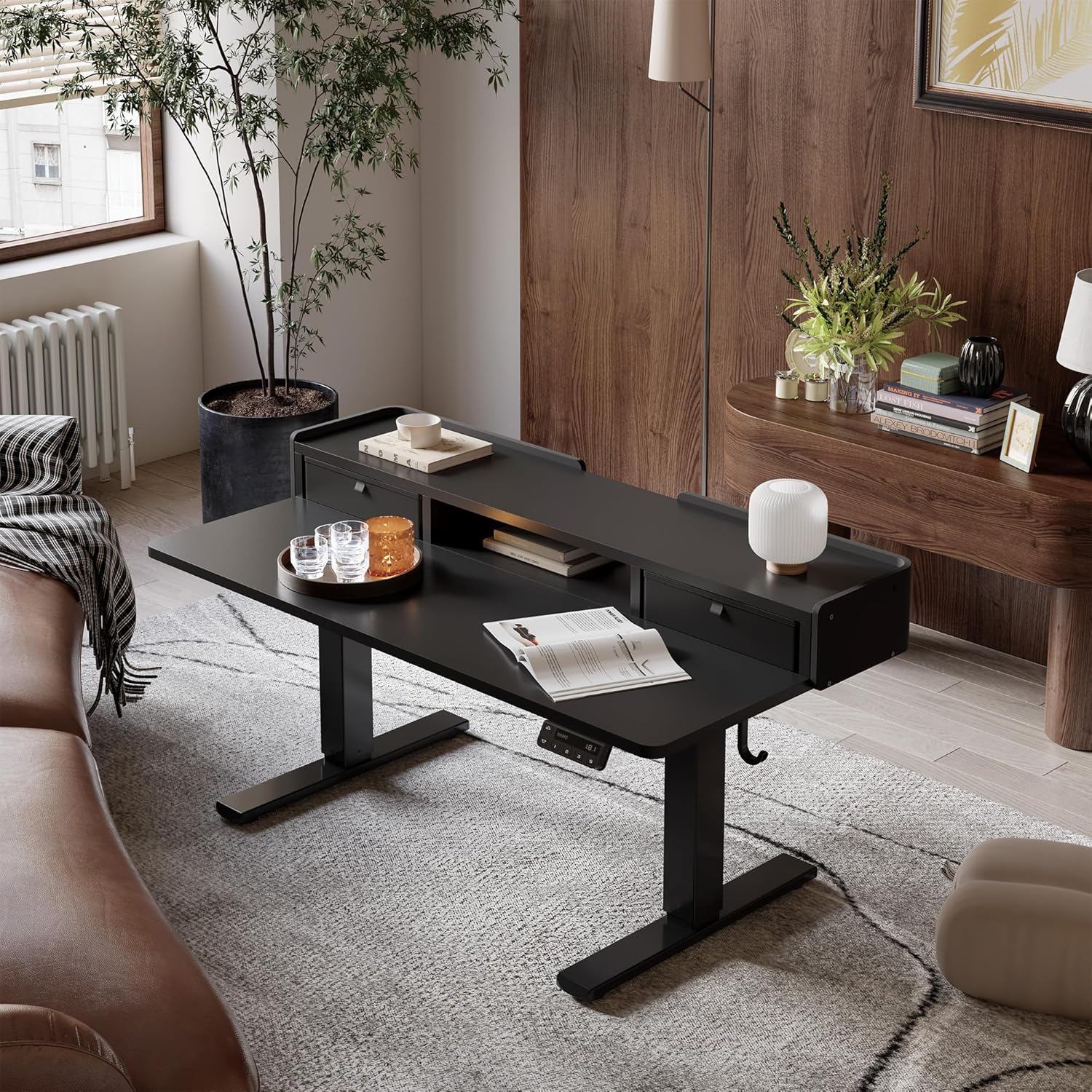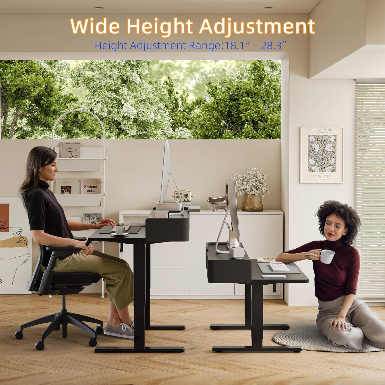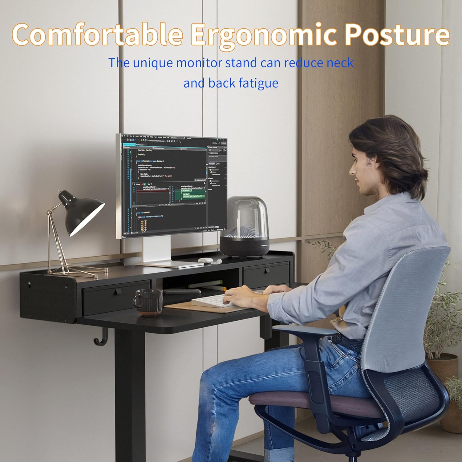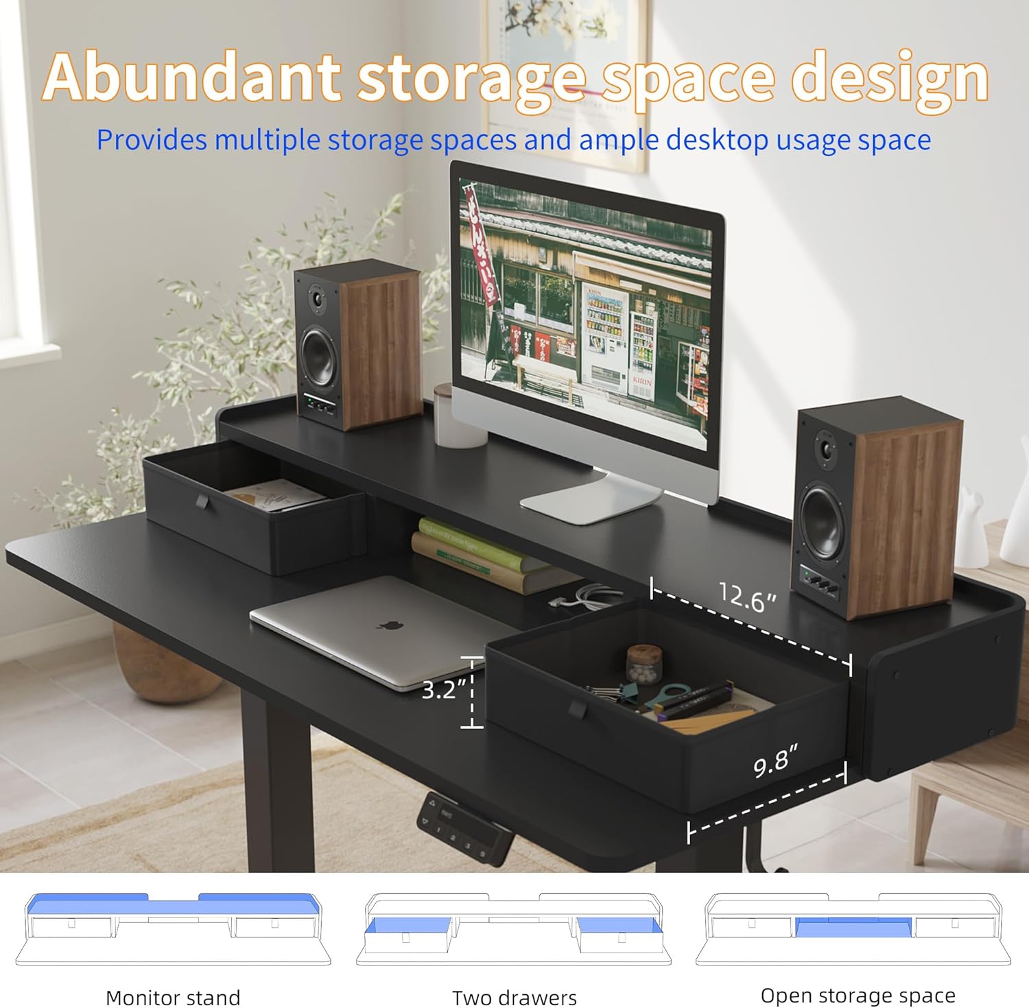 【Practical Design】The electric lifting desk of YIHAYO is equipped with a monitor stand for placing monitors and other devices, enabling the line of sight to be parallel to the screen, which helps relieve neck and back pressure. Two fabric drawers offer ample storage space for files, books, cables, etc., keeping the desktop tidy