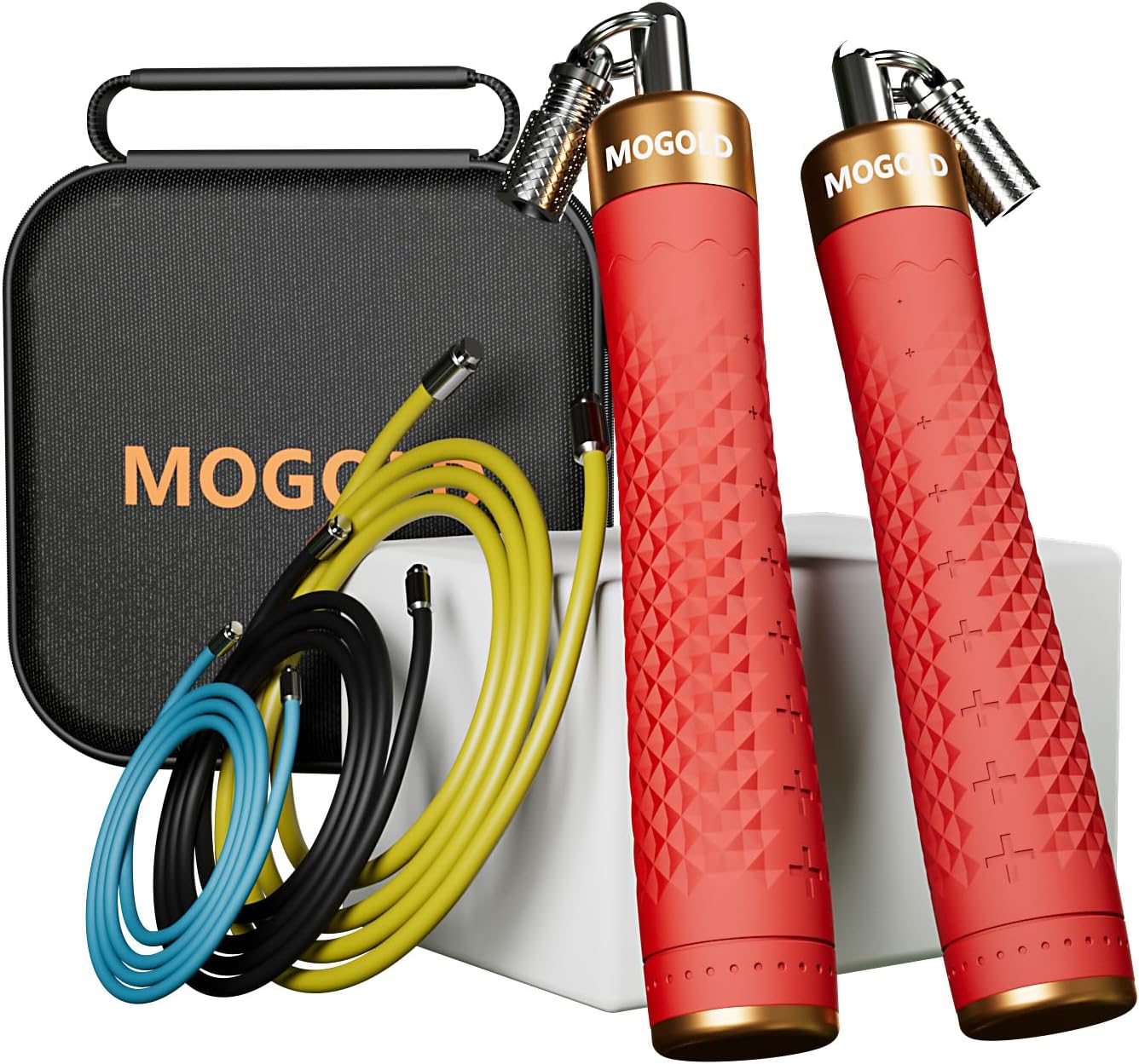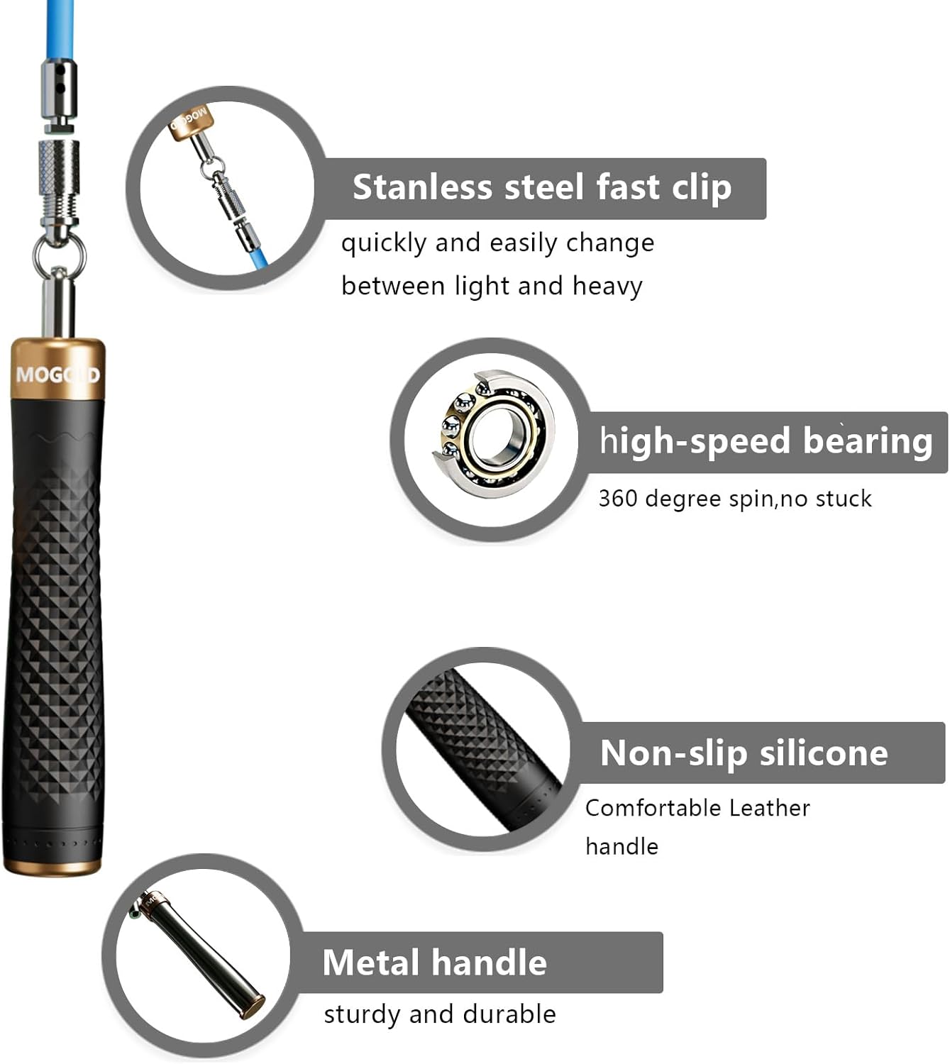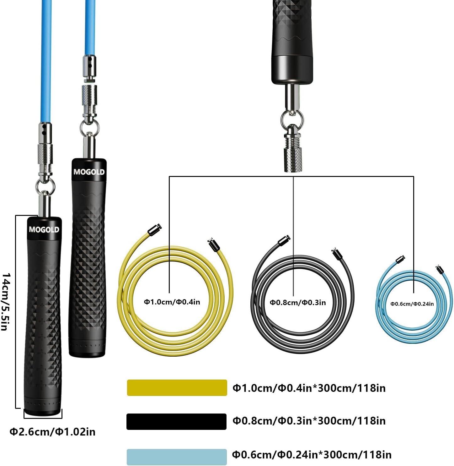 Elevate your fitness routine with this premium weighted jump rope set featuring three interchangeable speed cables. The set includes two professional-grade handles with a distinctive diamond-textured grip pattern and gold accents, measuring 1.02 inches in diameter and 5.5 inches in length. Each cable spans 118 inches with varying thicknesses – 0.24, 0.3, and 0.4 inches (color-coded in blue, black, and yellow) – allowing you to progress from beginner to advanced skill levels. The handles feature high-speed bearings for smooth 360-degree rotation and a quick-release mechanism for easy cable changes. The textured non-slip silicone grip ensures secure control during intense workouts, while the durable metal construction provides lasting performance. The set comes complete with a sturdy carrying case featuring the MOGOLD logo, perfect for organization and transport. Whether you’re into CrossFit, speed training, or general fitness, this versatile jump rope set adapts to your training needs with its multiple cable options and ergonomic design.