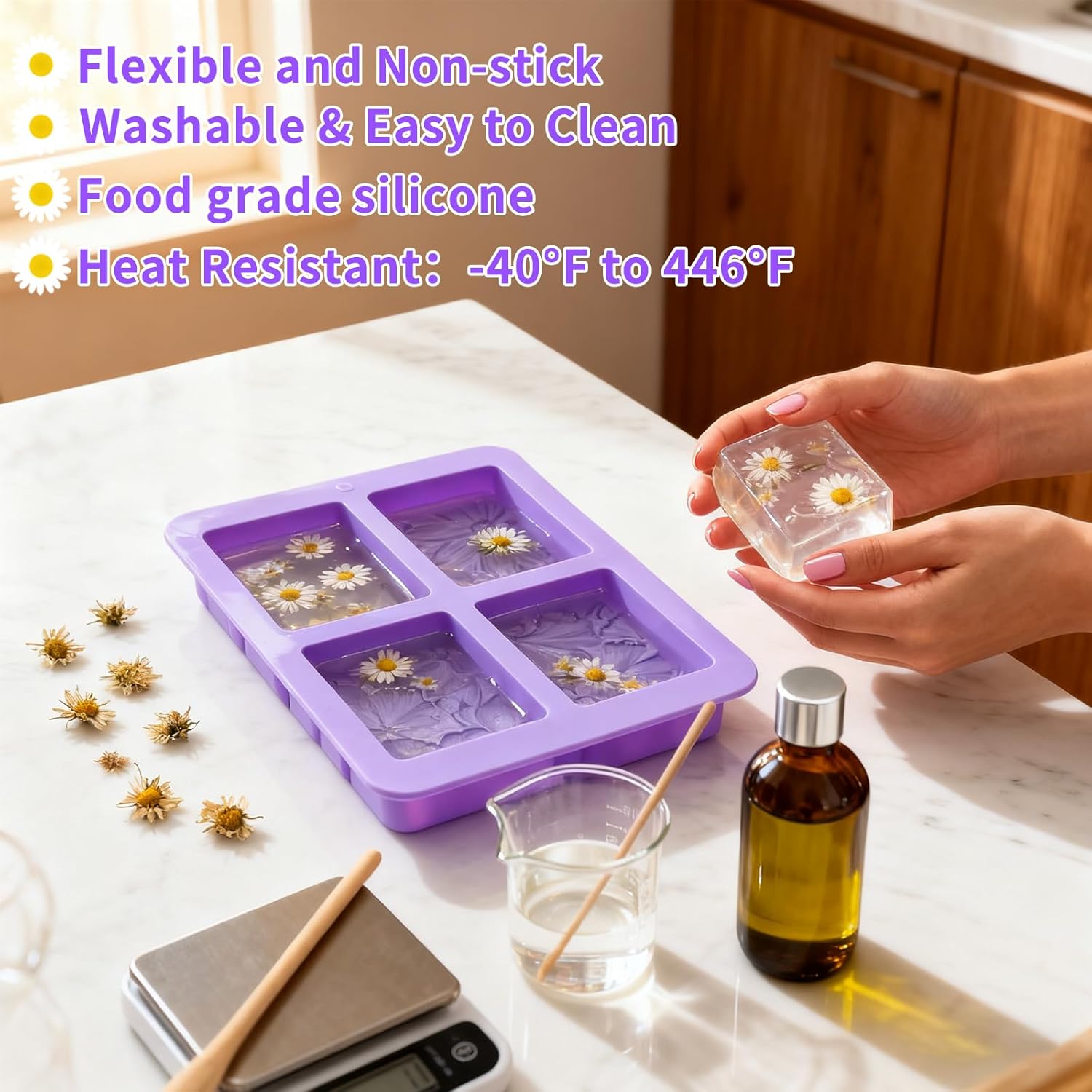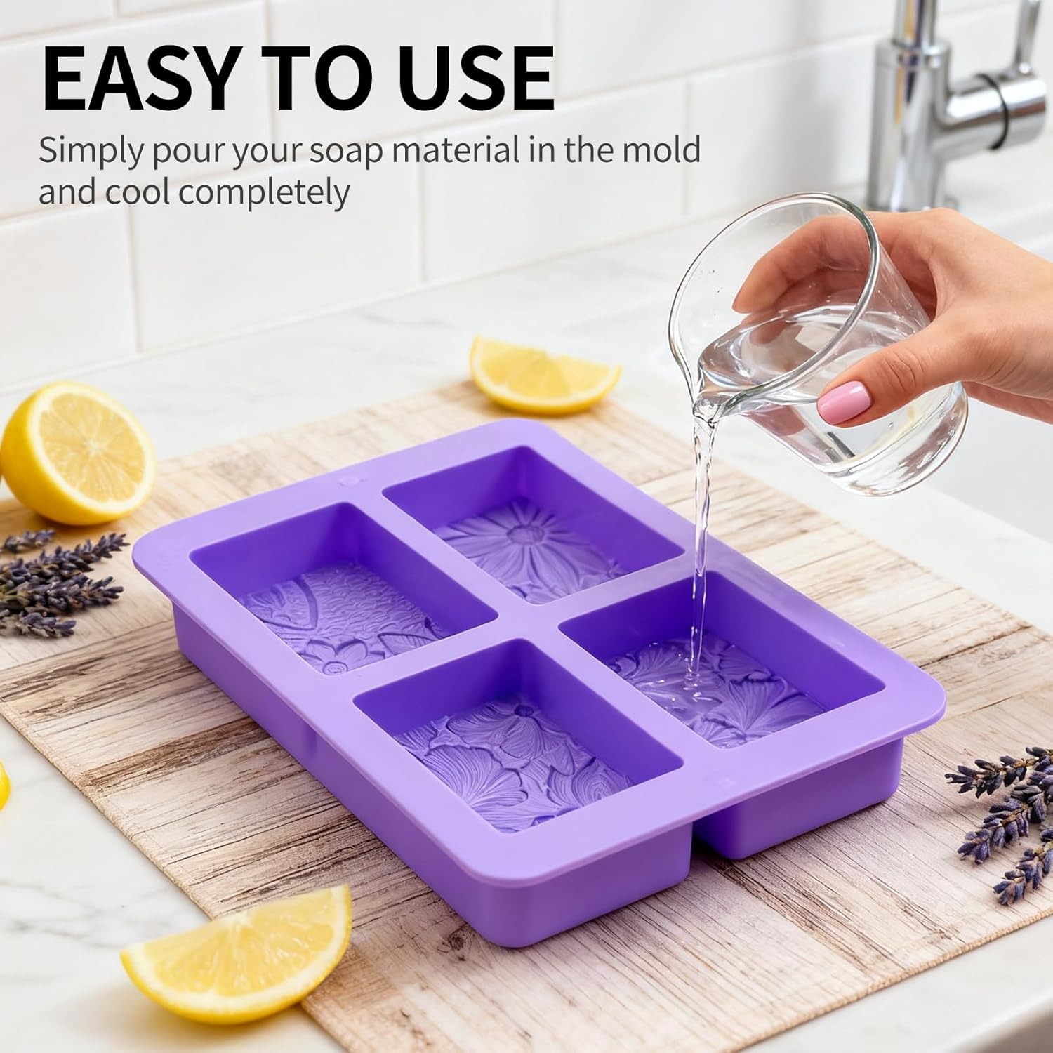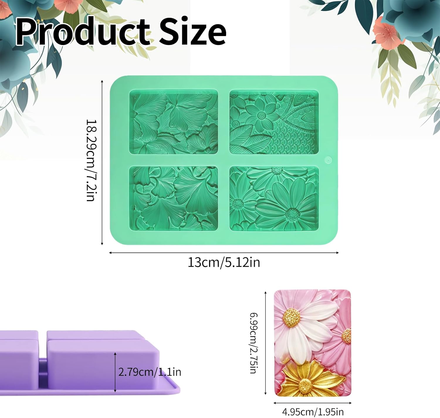 Perfect Size Silicone Molds: Includes 2 silicone molds, each with 4 rectangular cavities featuring intricate 3D flower designs. Each mold measures 5″×7″×1″, with cavities sized 2.7″×1.9″×1″. Flexible for easy shaping—perfect for crafting beautiful handmade soaps or chocolates.