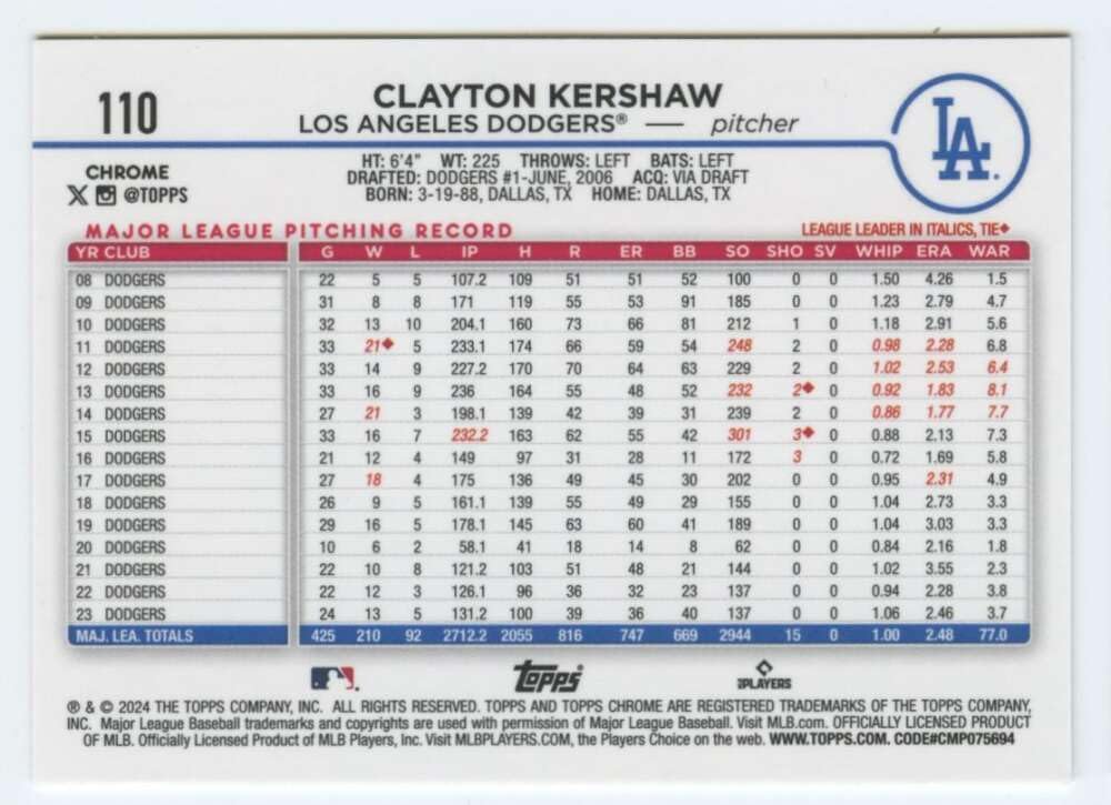2024 Topps Chrome #110 Clayton Kershaw Los Angeles Dodgers MLB Baseball Base Trading Card