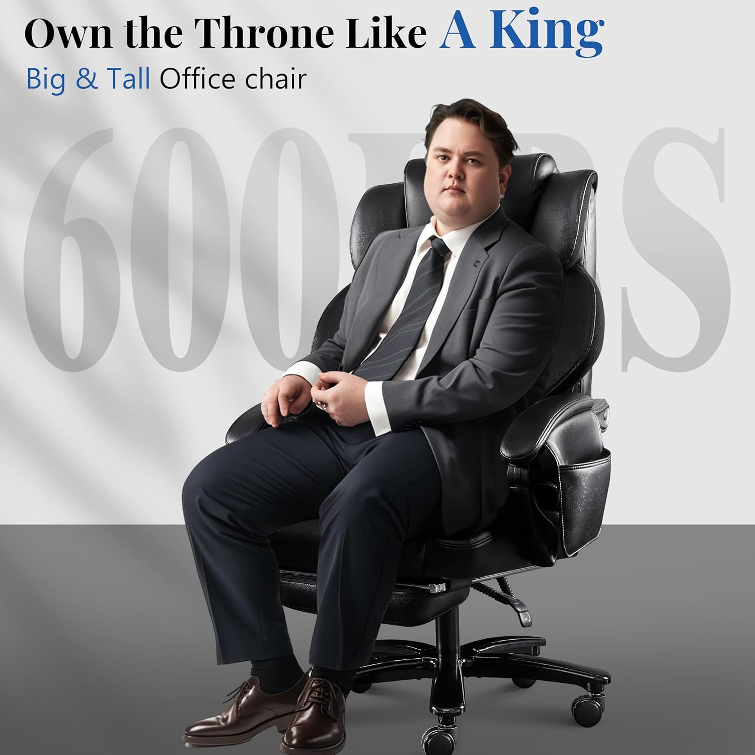 𝑩𝒖𝒊𝒍𝒕 𝒇𝒐𝒓 600𝑳𝑩𝑺, 𝑨𝒅𝒋𝒖𝒔𝒕𝒂𝒃𝒍𝒆 𝑹𝒆𝒄𝒍𝒊𝒏𝒆𝒓 𝑪𝒉𝒂𝒊𝒓 𝑳𝒐𝒗𝒆𝒅 𝒃𝒚 𝑨𝒍𝒍! The Big and tall office chair is more than just a chair, it’s also a 600LBS weightlifting champion. You can adjust the height so taller people can customize the perfect sitting experience. The extendable footrest gives your legs the VIP treatment when you relax. Here’s a thoughtful tip, if you feel the footrest isn’t long enough, you can use reclining backrest that tilts 90°-155°like a bed, freeing up more legroom. Your throne, your call.