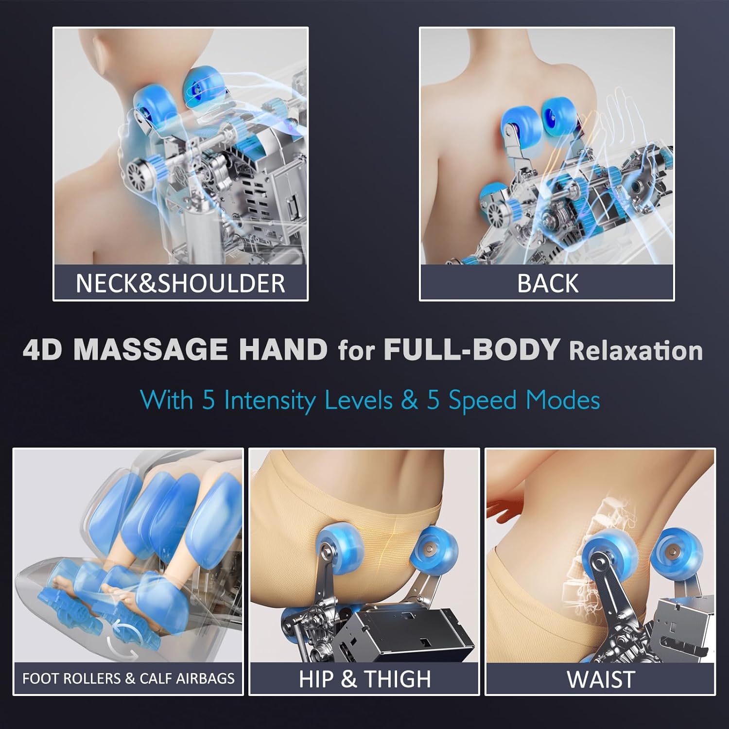 Massage Chair Full Body & Shiatsu-style Technology:Experience deep relief with our full body zero gravity massage chair. This chair features advanced 4D technology with SL-track rollers that target your neck, shoulders, back, and thighs for a deep shiatsu-style massage. With multiple auto programs and techniques featuring calf massager and foot rollers, it’s the premium massage chair designed for muscle relaxation and post-workout relaxation.