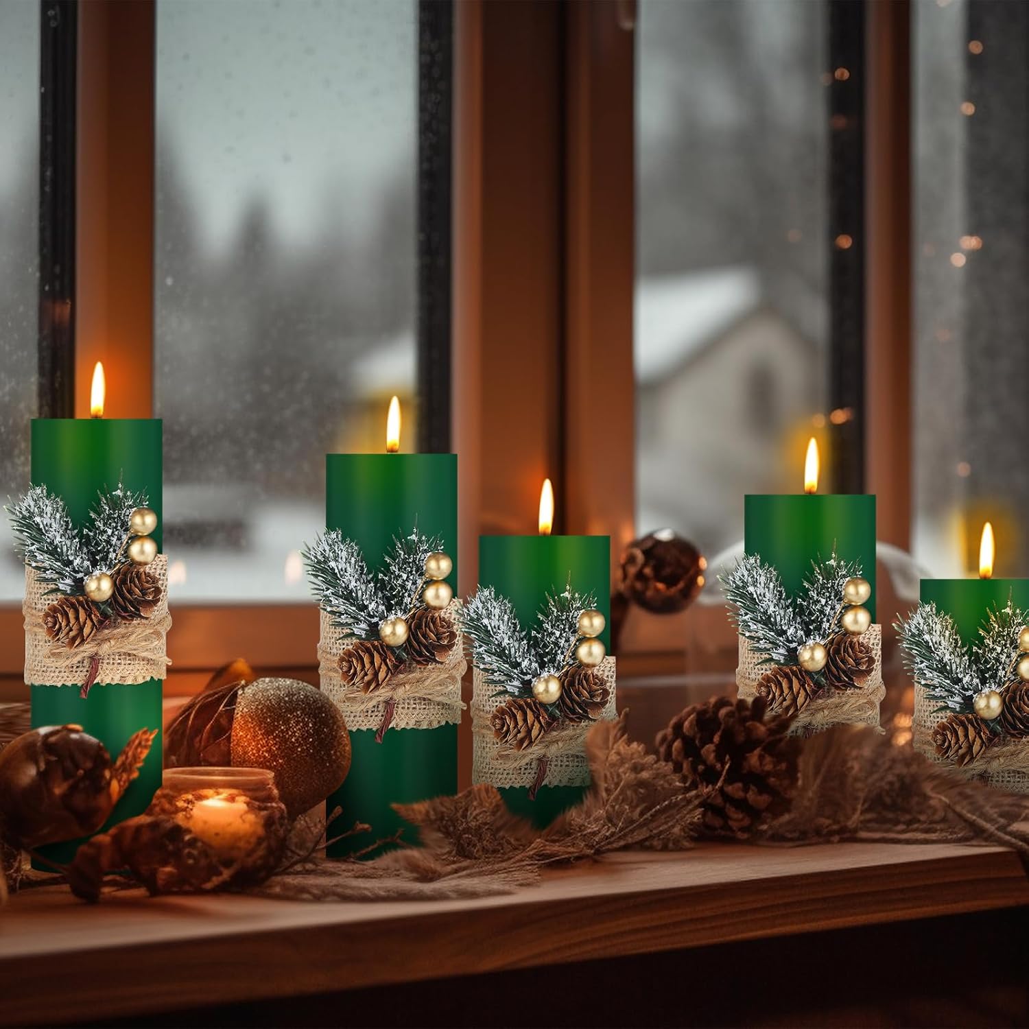 Fine Packaging: christmas green pillar candle come in a pack of five; The candles are printed with leaves, pine cones, various colors and sufficient quantity to meet your Christmas decoration needs, which fits in well with the Christmas theme