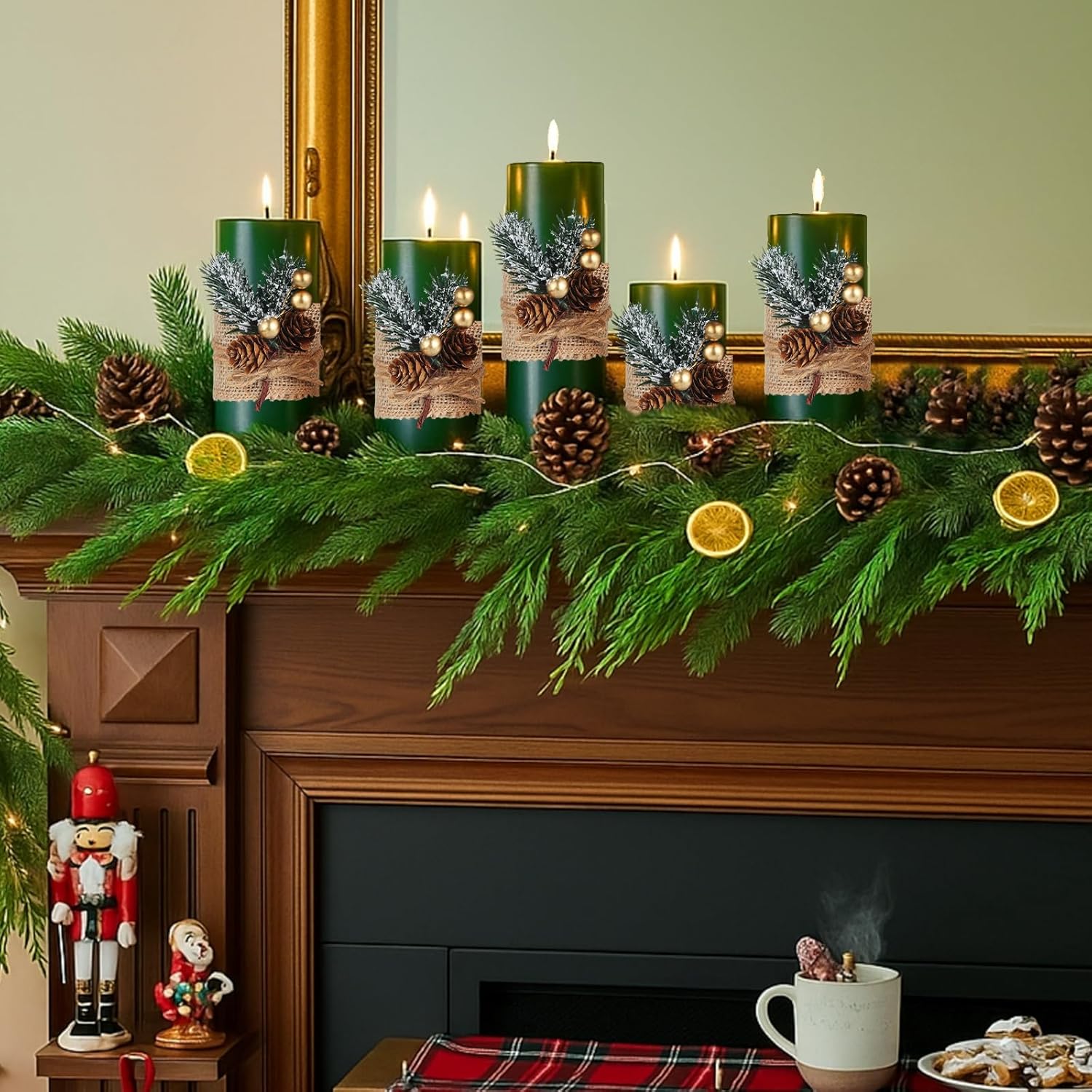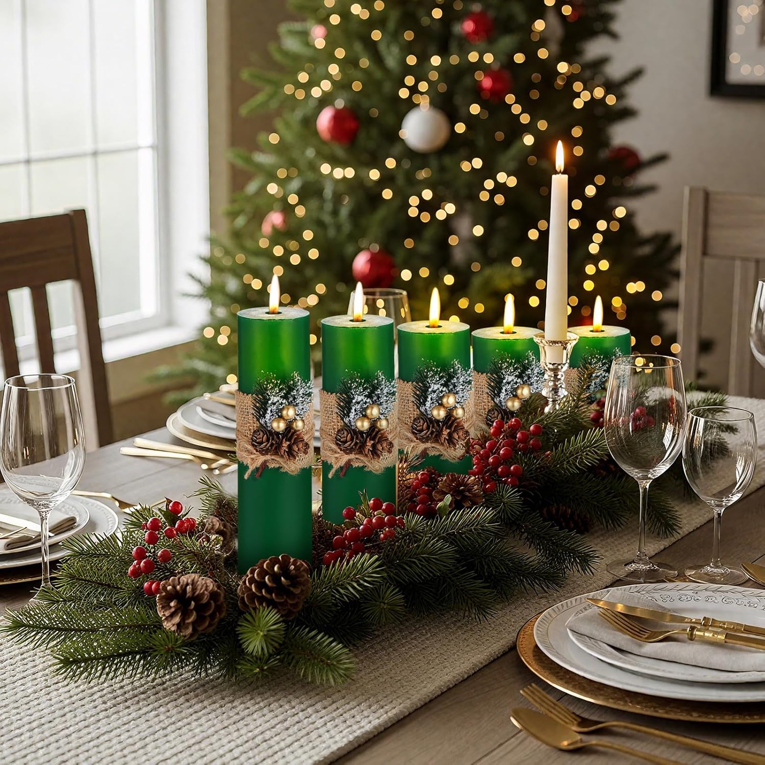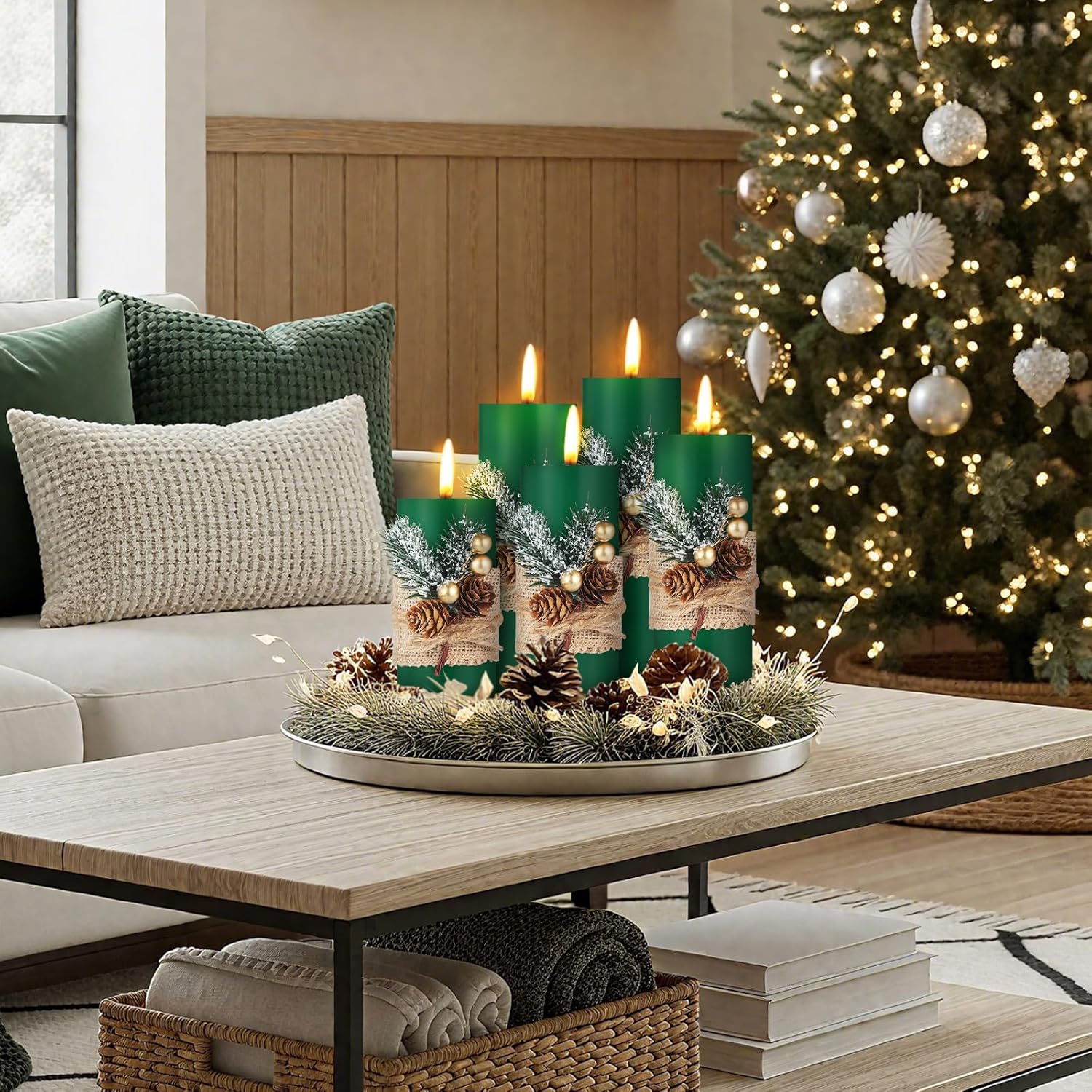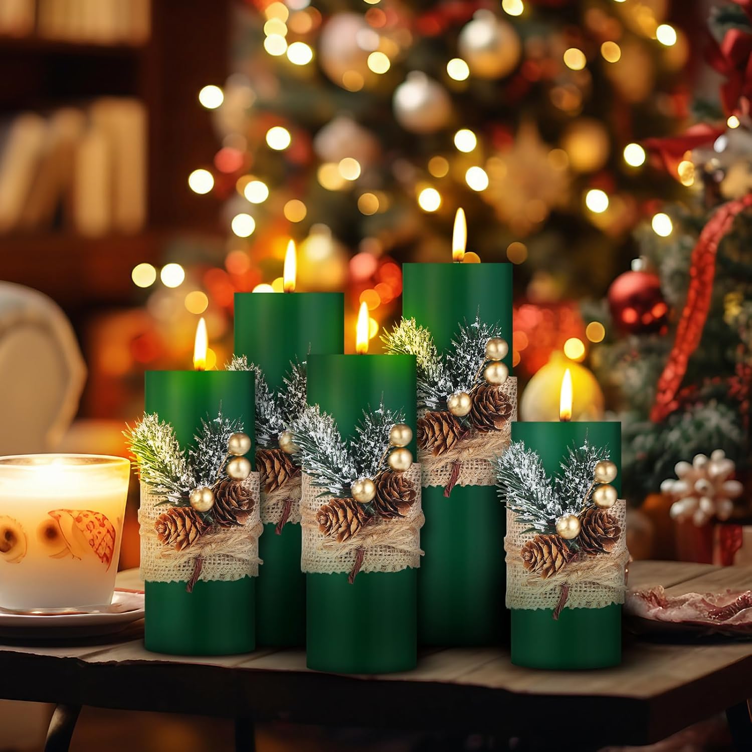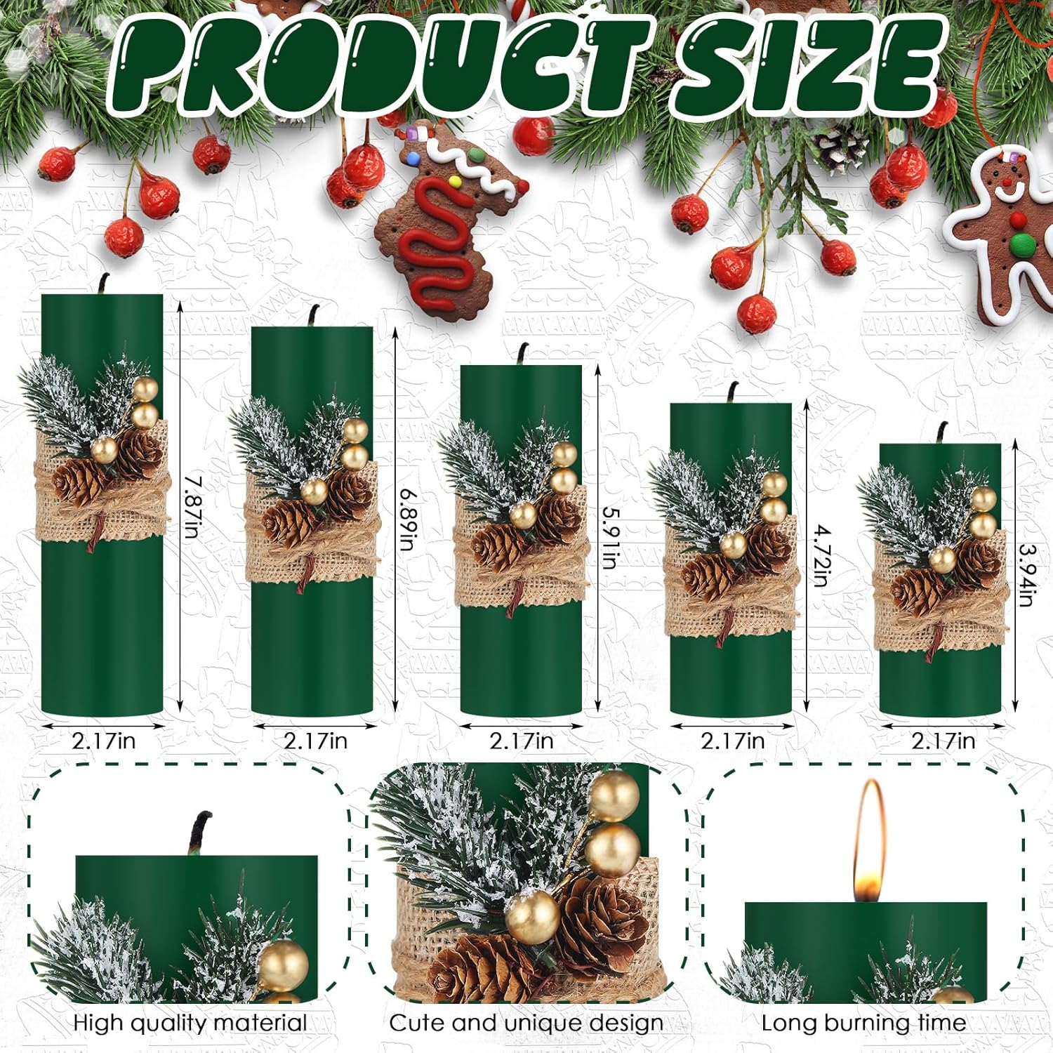 Fine Packaging: christmas green pillar candle come in a pack of five; The candles are printed with leaves, pine cones, various colors and sufficient quantity to meet your Christmas decoration needs, which fits in well with the Christmas theme