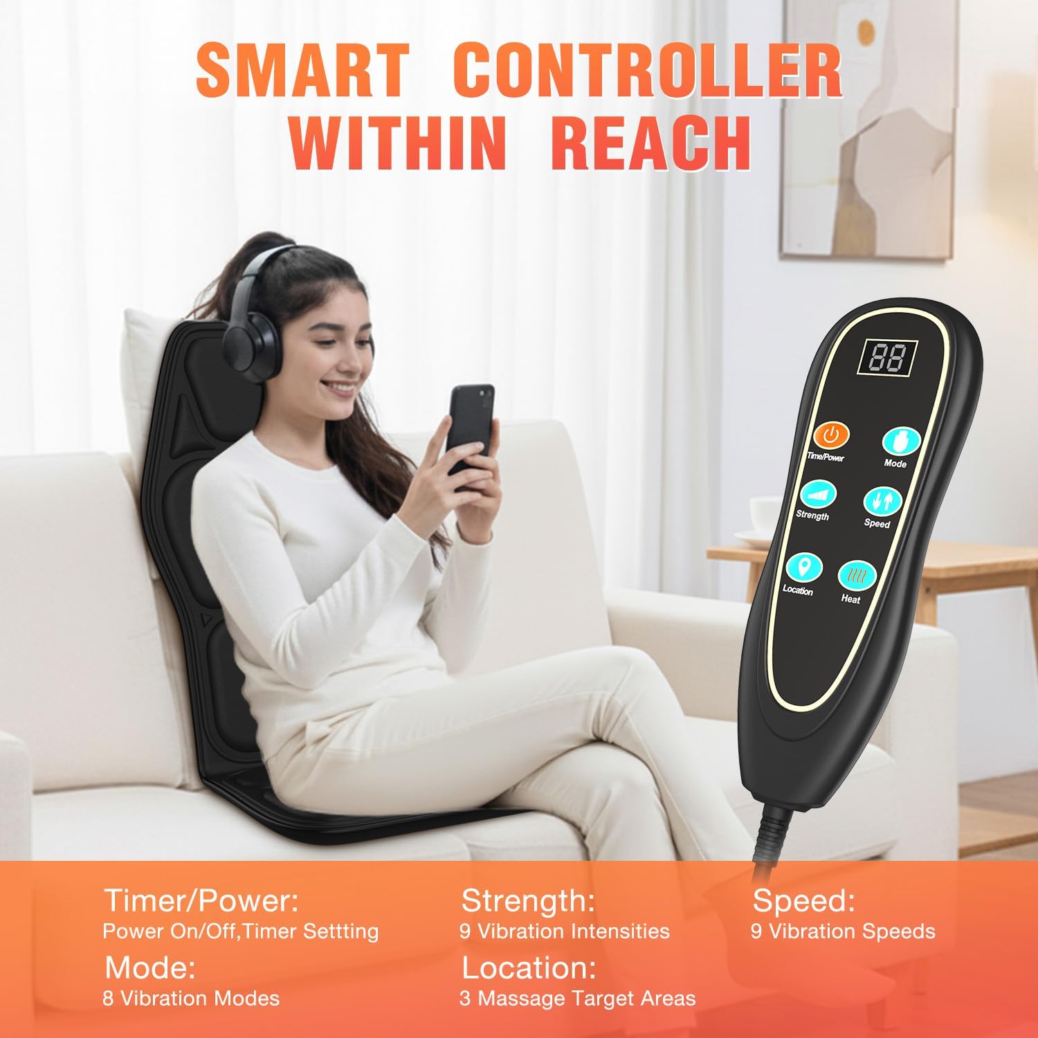 Customizable Massager Settings–This seat massager features 8 preset modes and comes with a wired remote control, allowing you to target specific zones (neck, back, hip, or thigh) with 9 adjustable intensity & speed levels. This chair massager also includes extra manual lumbar support and optional 3-level heating, catering to your personal comfort needs.