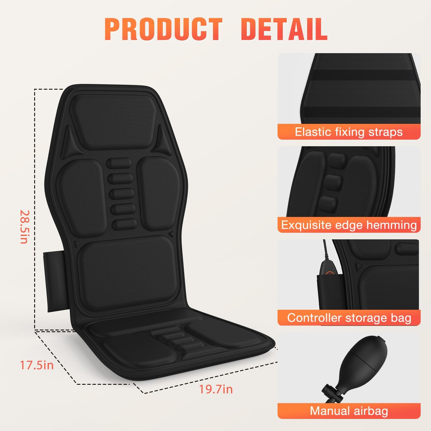 Customizable Massager Settings–This seat massager features 8 preset modes and comes with a wired remote control, allowing you to target specific zones (neck, back, hip, or thigh) with 9 adjustable intensity & speed levels. This chair massager also includes extra manual lumbar support and optional 3-level heating, catering to your personal comfort needs.