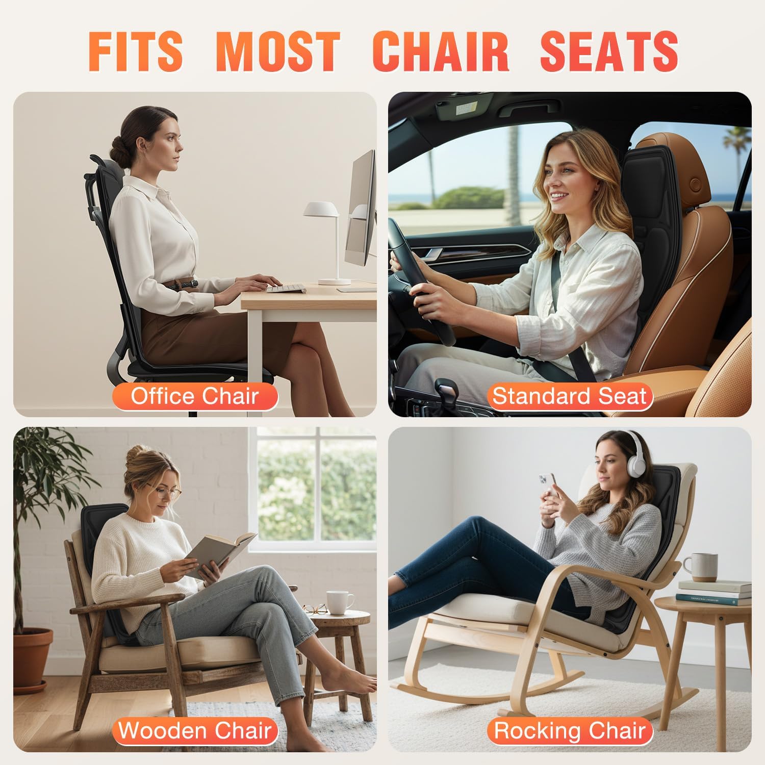 Advanced Back Massage–Our massage seat cushion features 6 built-in back motors and 2 seat motors, delivering a rhythmic, full-body relaxation experience. Whether you’re dealing with tight shoulders and back after a long workday or lower back and hip discomfort from prolonged sitting, this back massager for pain relief deep tissue provides targeted pain relief and a soothing daily massage experience.