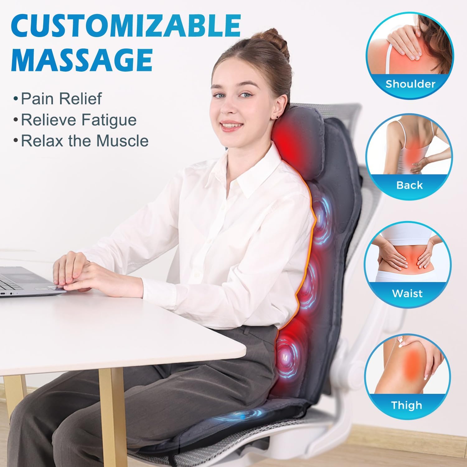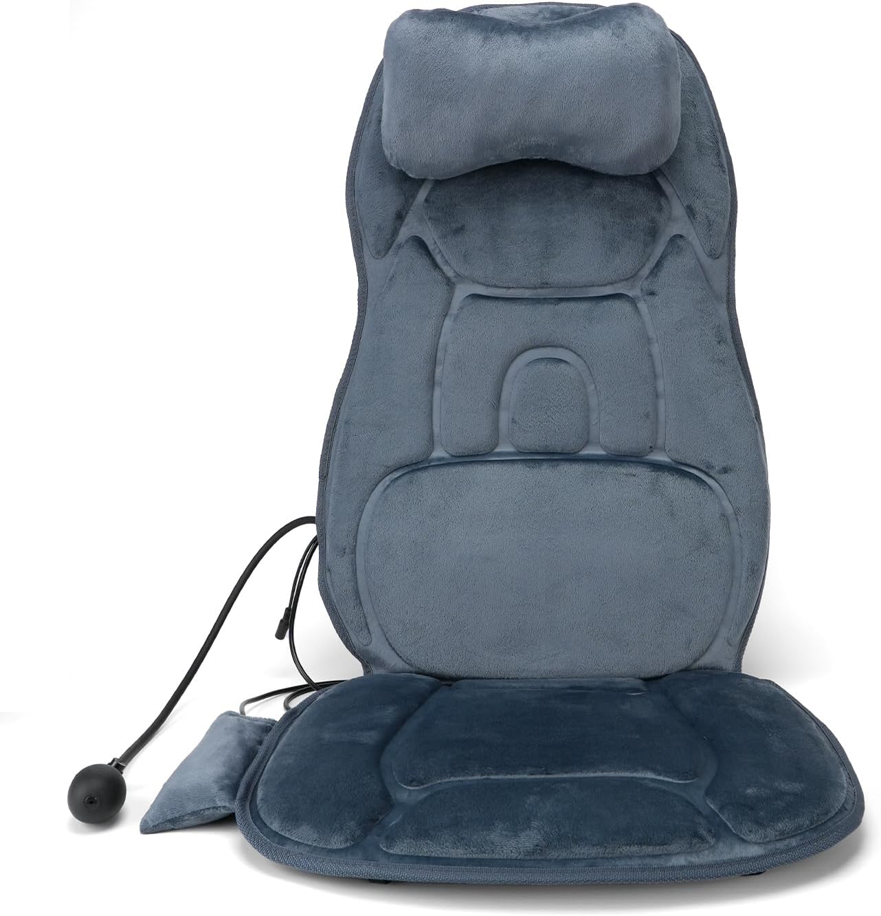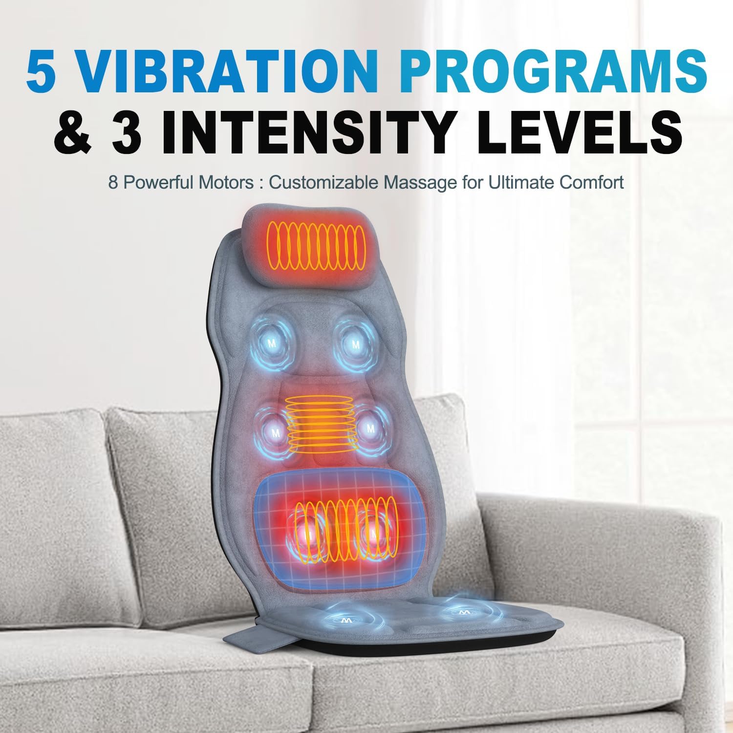 Full-Body Vibrating Massage with Heat: The back massager for chair features 8 powerful vibration motors targeting your back, shoulders, and thighs. Enjoy soothing warmth with full-back heating and a heated ergonomic head pillow. This chair massager pad offers 2 adjustable warmth levels (114°F-140°F) for personalized relief. (Note: this is a vibrating massager only, not including rolling or kneading features like shiatsu massagers.)