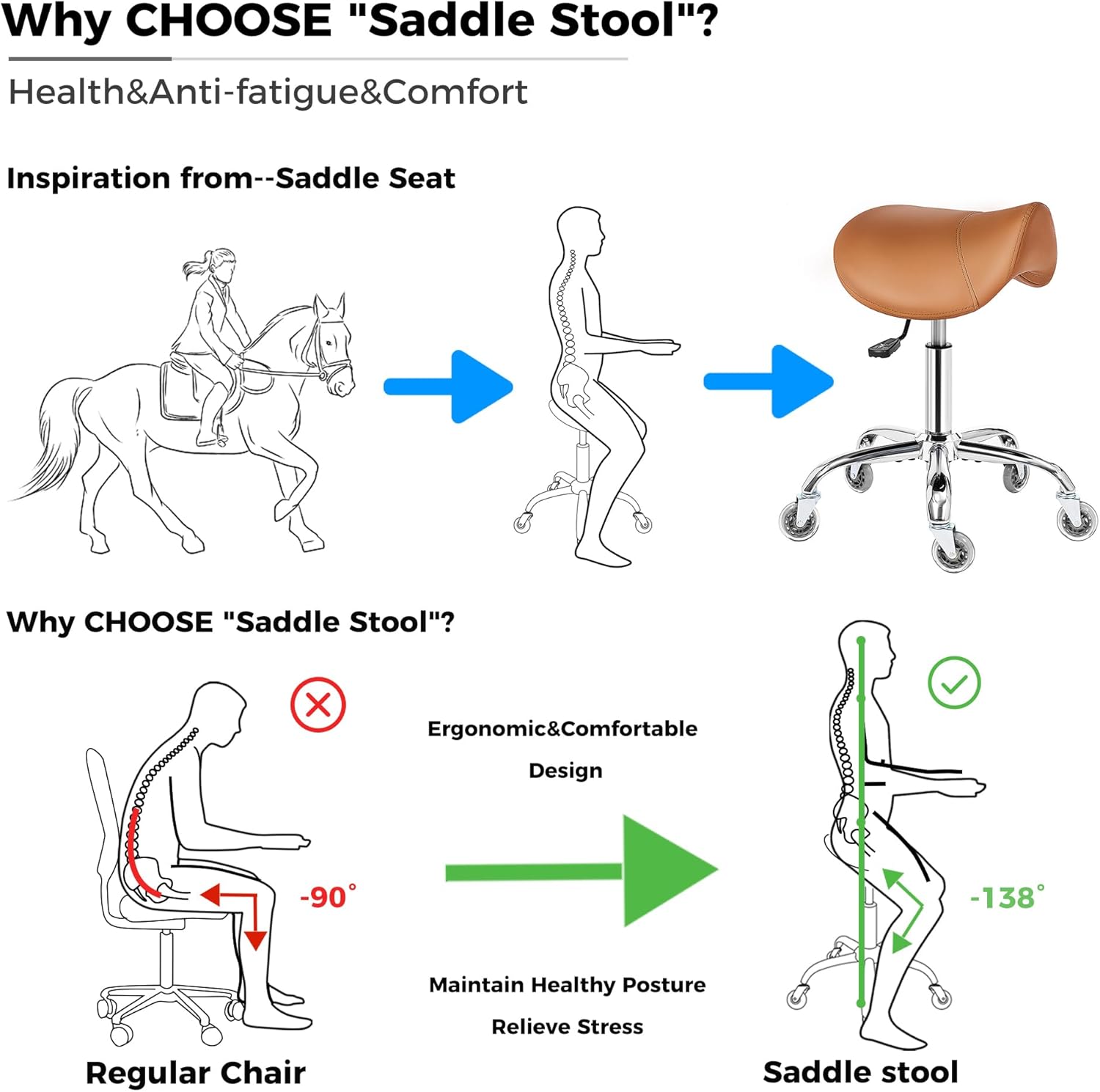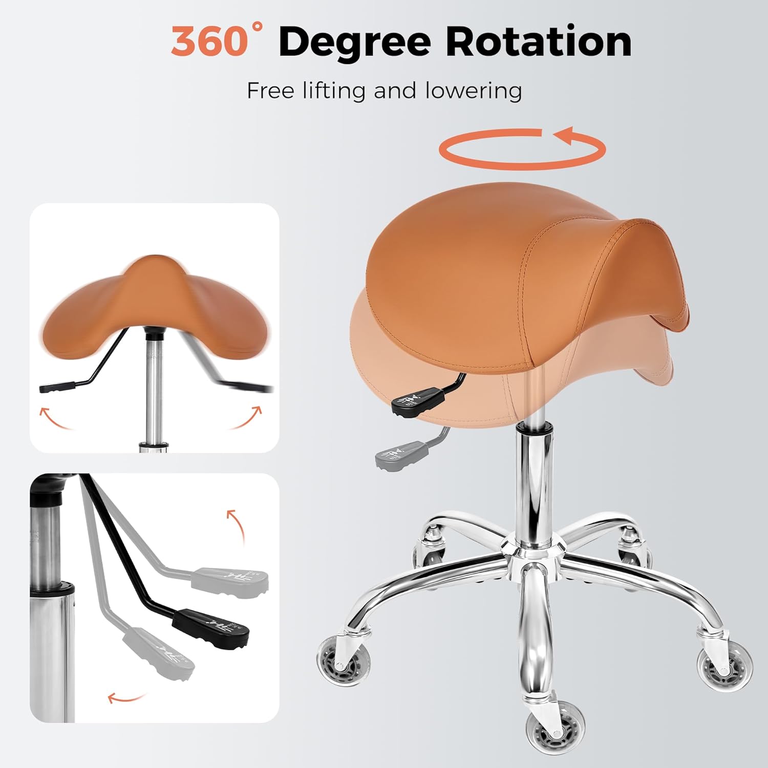 Silent Sliding Casters: This saddle stool features 360-degree swivel function for easy rotation. Equipped with 5 swivel casters, it is easy and smooth to move, does not make noise, does not snag hair, and prevents scratches on floors
