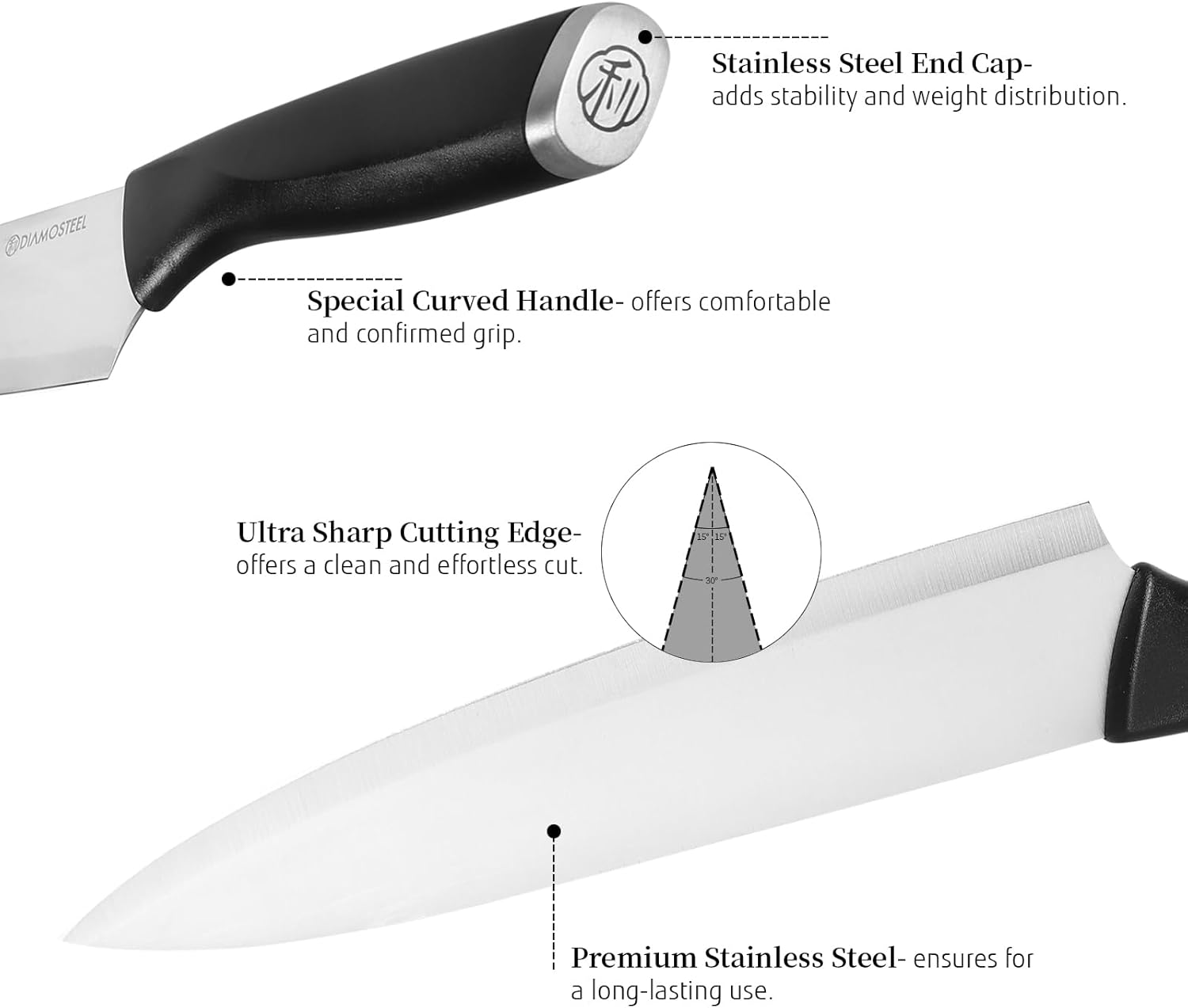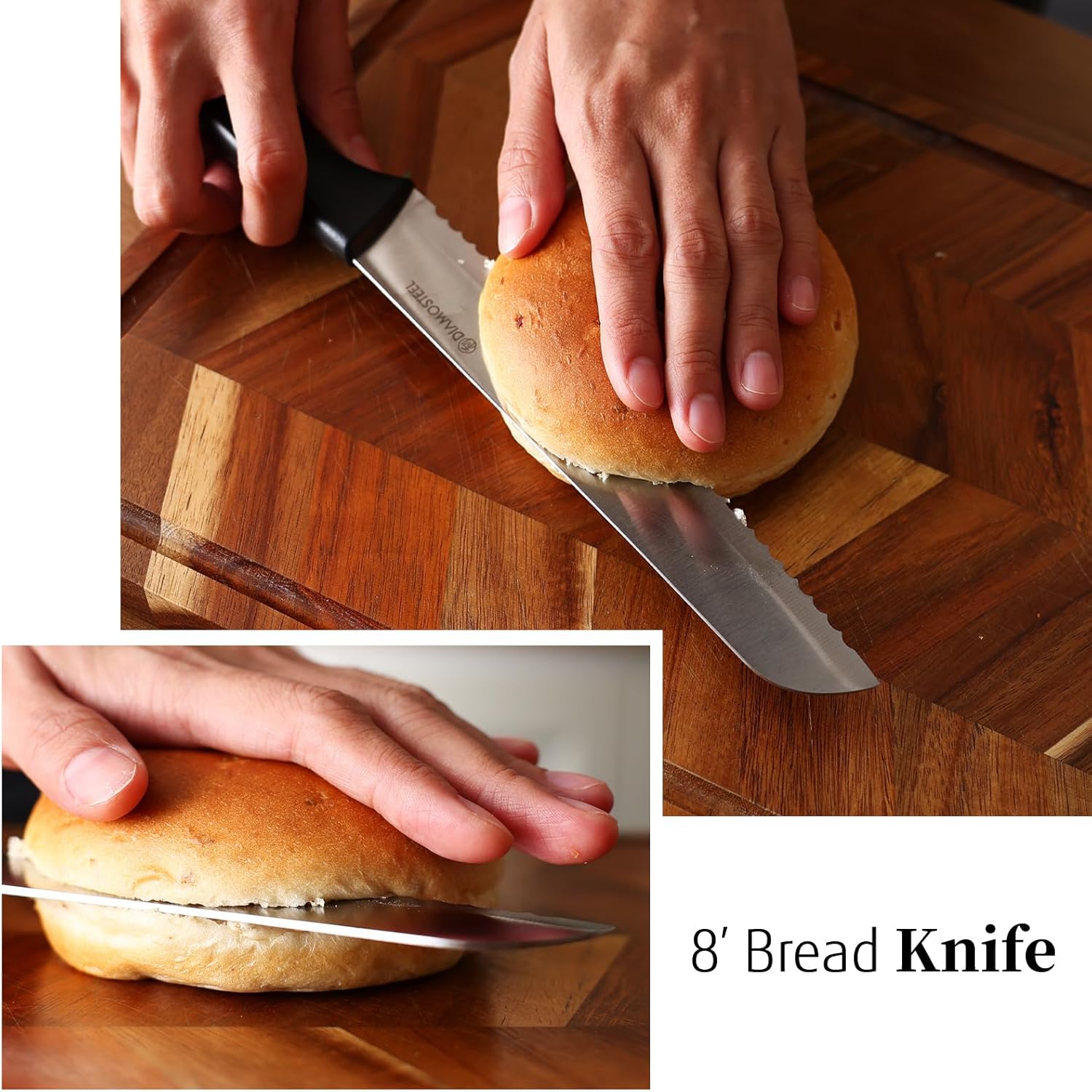 All-in-One Knife Set : Includes 8″ Chef Knife, 8″ Slicing Knife, 8″ Bread Knife, 5″ Utility Knife, 3.5″ Paring Knife, Kitchen Shears, and a stylish wooden block for safe storage. Perfect for slicing, chopping, and meal prep.