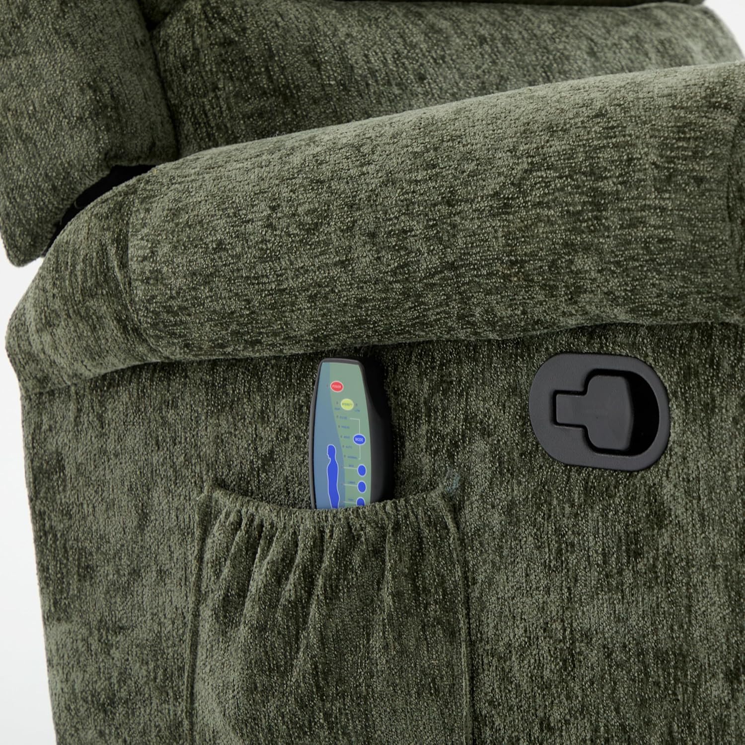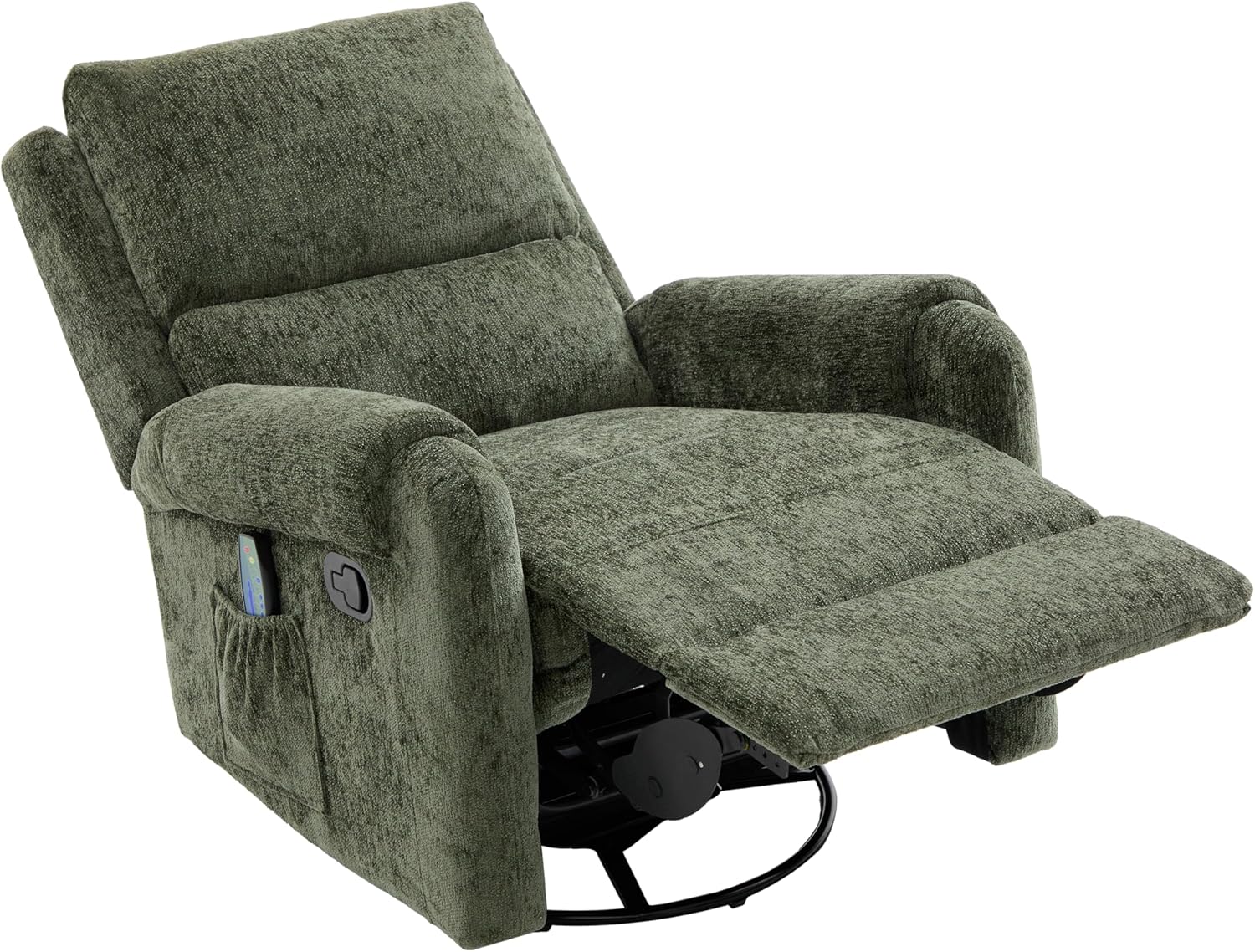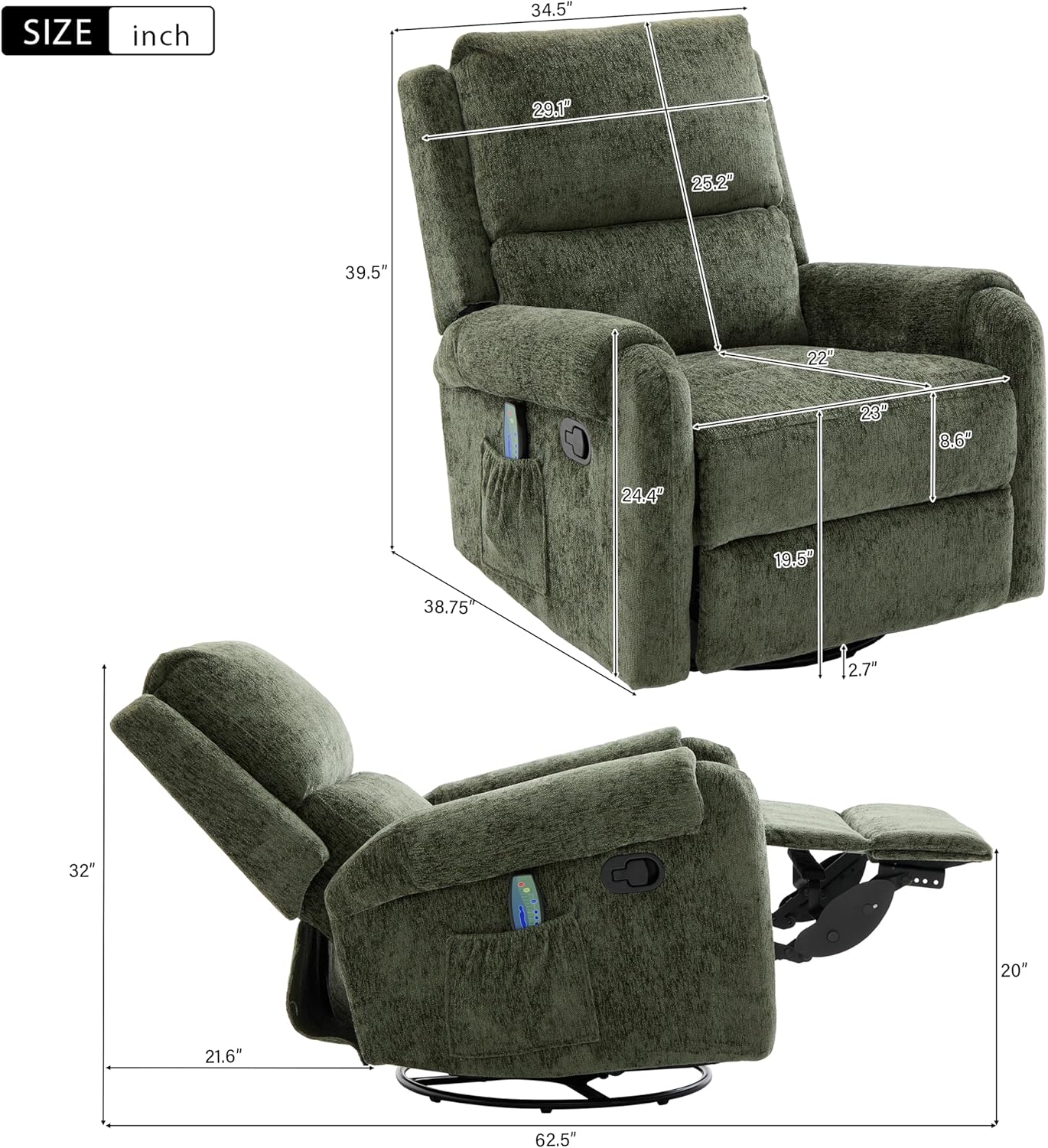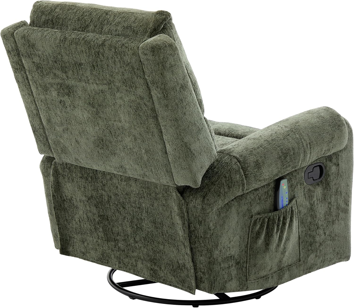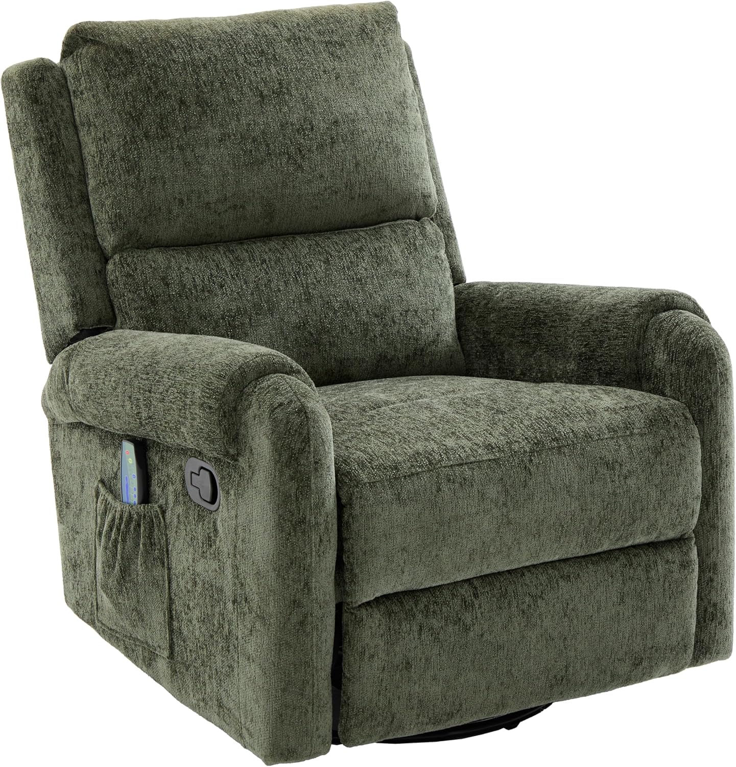 Bring ultimate comfort and relaxation into your home with this chenille upholstered massage recliner. Designed for full-body support and stress relief, it features eight massage modes, adjustable reclining positions, and a gentle rocking function. The durable wood and metal construction ensure lasting stability, while the breathable chenille fabric and convenient storage pocket combine luxury with practicality—perfect for your living room, bedroom, or reading nook.