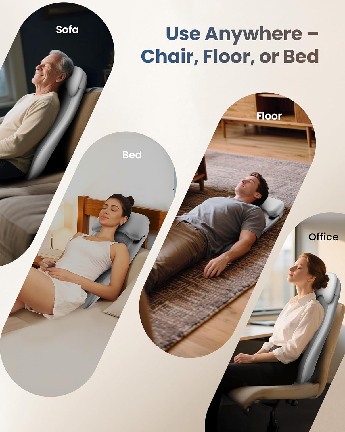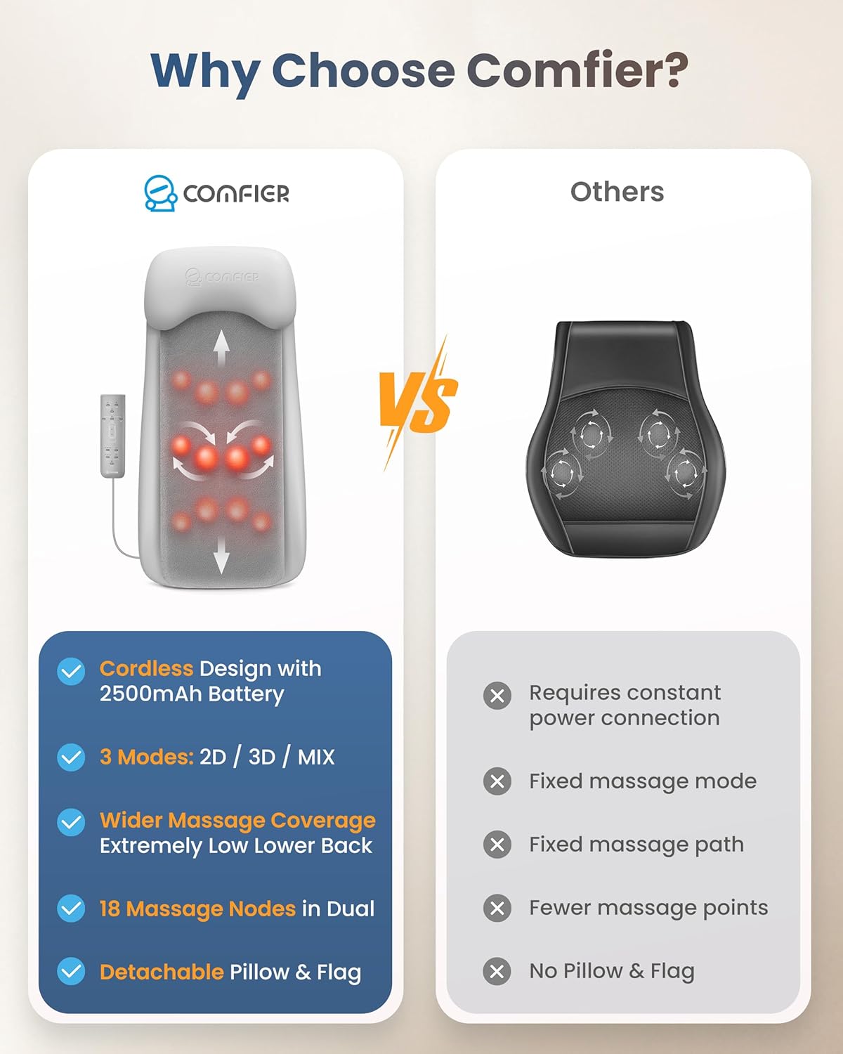 Rechargeable & Cordless – Relax Anywhere:Unlike most massage cushions that must stay plugged in, COMFIER cordless back massager with heat is equipped with a 2500mAh rechargeable lithium battery, giving you the freedom to enjoy a massage without being tied to a wall outlet. A full charge takes just 3.5 hours and provides up to 1.6 hours of wireless use – perfect for outdoor spaces, patios, RVs, or office chairs. You can also plug it in anytime for continuous power, giving you the best of both worlds.