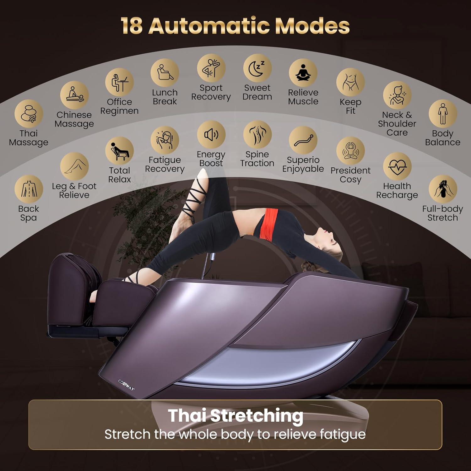 18 automatic modes: Total Relax, Chinese Massage, Relieve Muscle, Body Balance, Thai Massage, Full-body Stretch, Neck & Shoulder Care, Spine Traction, Leg & Foot Relieve, Superior Enjoyable, President Cosy, Keep Fit, Office Regimen, Health Recharge, Energy Boost, Lunch Break, Back Spa, Sweet Dream
