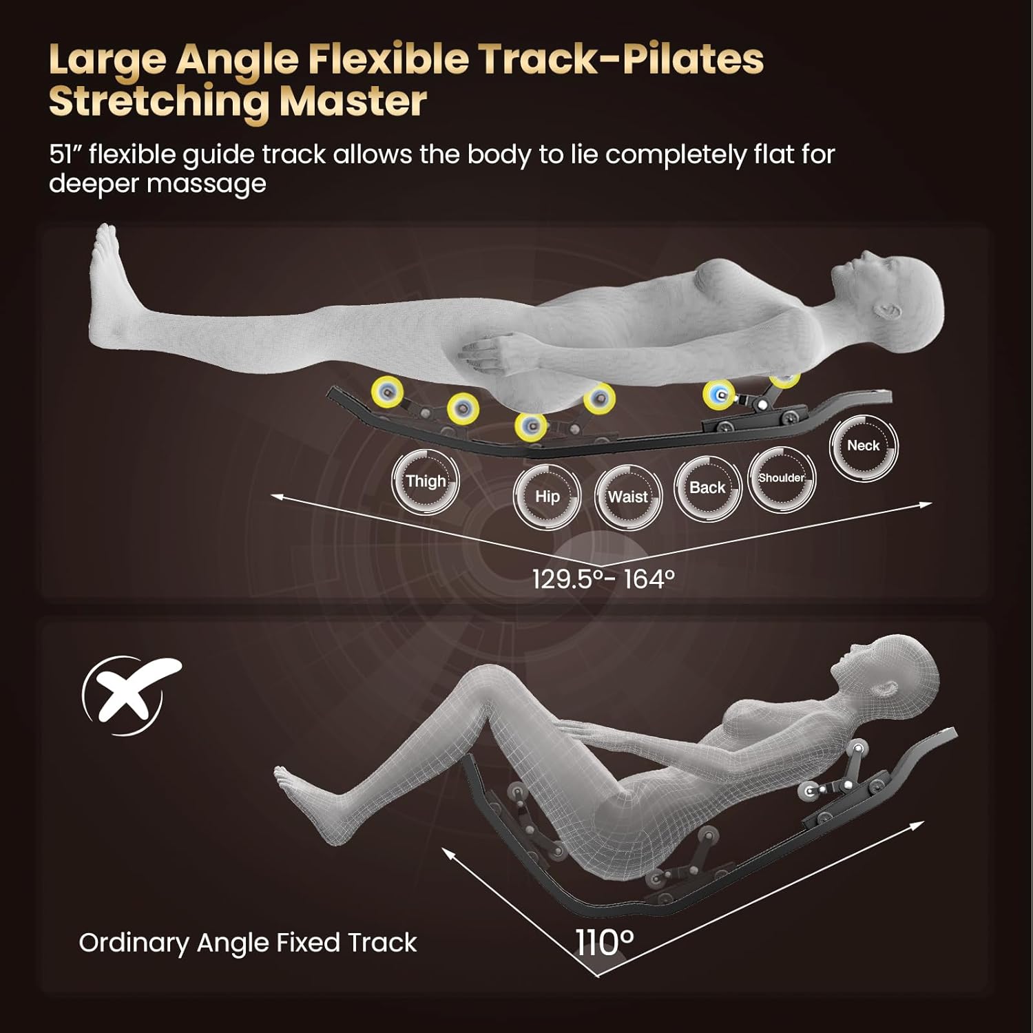 Innovative 4D Massage & Large Angle Flexible Track: Featuring advanced 4D massage technology, the manipulator can be adjusted up & down, left & right, forward & back, providing a more precise massage. The 51″ flexible guide track can be adjusted from 129.5°-164° to allow the body to lie completely flat for a deeper massage, tracing from neck to hips and thighs. The automatic body scanning system adjusts massage points and ranges.