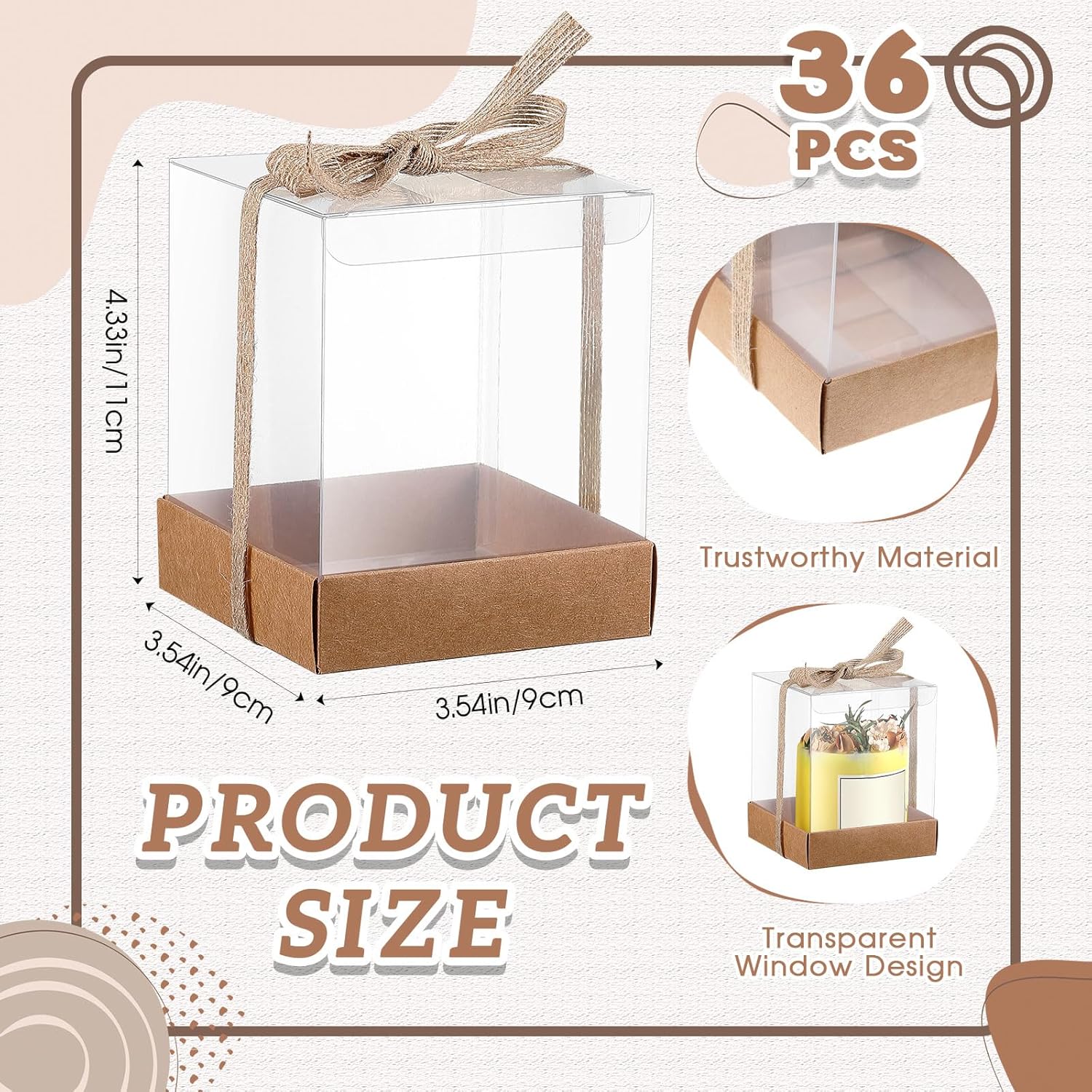 Cunno 36 Set 3.5 x 3.5 x 4.3 in Candle Package Transparent Gift Box 4-18 oz Handmade Tealight Candle Holder Bulk Paper Bottom Ribbon for Wedding Baby Shower Party Mug Cake Wine Glasses(Kraft Color)