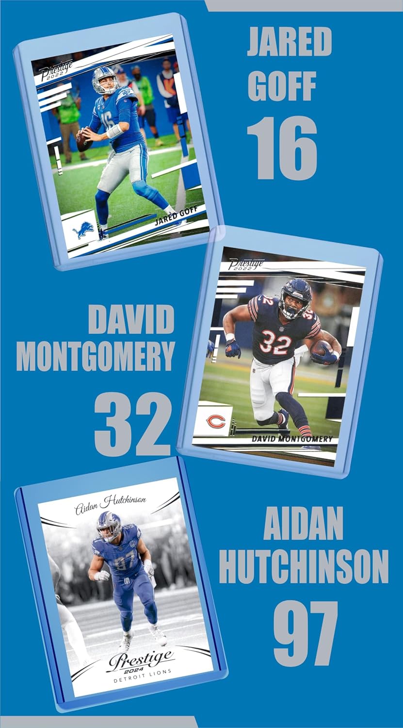 GUARANTEED – to include one card each of Jared Goff, David Montgomery, Amon-Ra St. Brown, Sam LaPorta, Jahmyr Gibbs, Barry Sanders, Aidan Hutchinson, and Calvin Johnson. Exact card of each player varies and may include cards in a past team jersey.