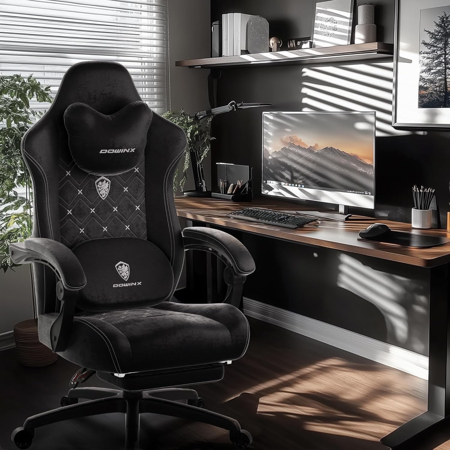 Dowinx Gaming Chair with Heated Massage Lumbar Support,Big and Tall Fabric Gaming Chairs for Adults with Footrest, Ergonomic Computer Game Chair with Poket Spring Cushions, 350lbs, Black