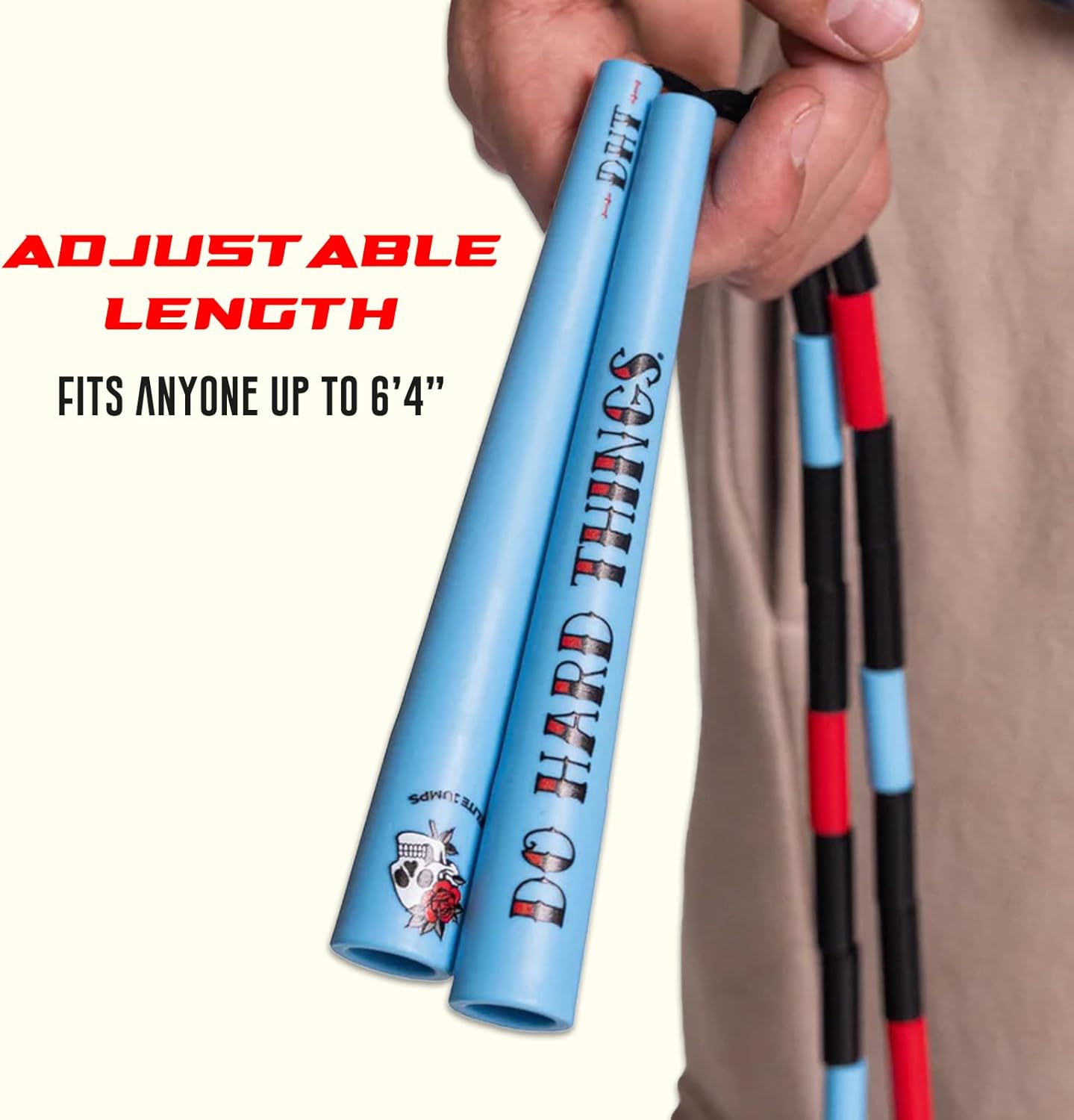 Adjustable Length – The adjustable length allows our Do Hard Things Beaded Jump Rope to fit jumpers of all ages and sizes. Its 10’ length fits jumpers up to 6′ 4 ” tall. Simply adjust the jump rope by loosening the washer/tie on the handle, removing beads, and cutting excess cord.