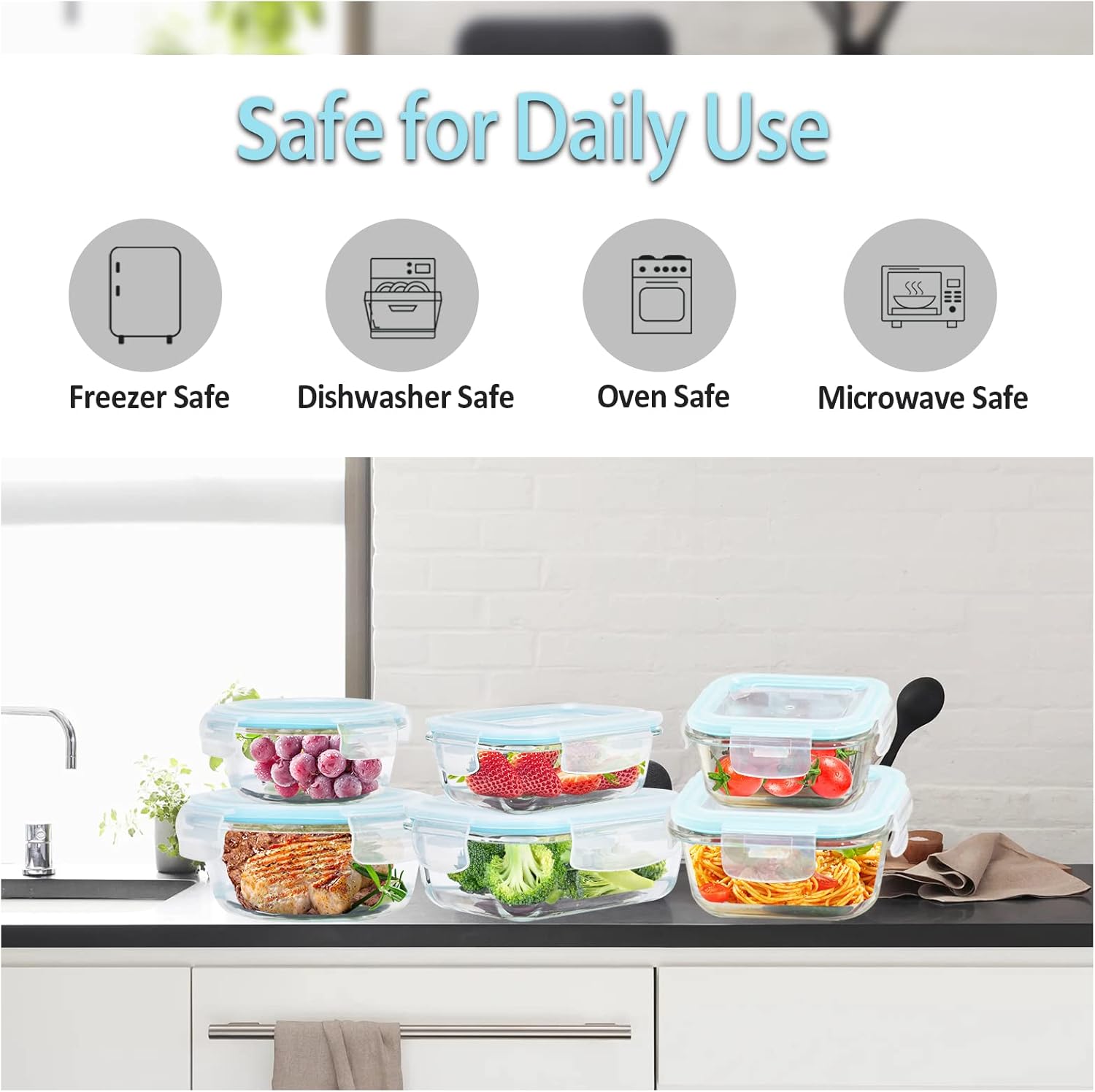 [LEAK PROOF & BPA FREE] Equipped with a silicone leak-proof sealing loop, four-sided locking, makes the glass containers for food storage with lids Leakproof and BPA-Free. There is no need to worry about leakage when you bring foods out with glass storage containers with lids for food.