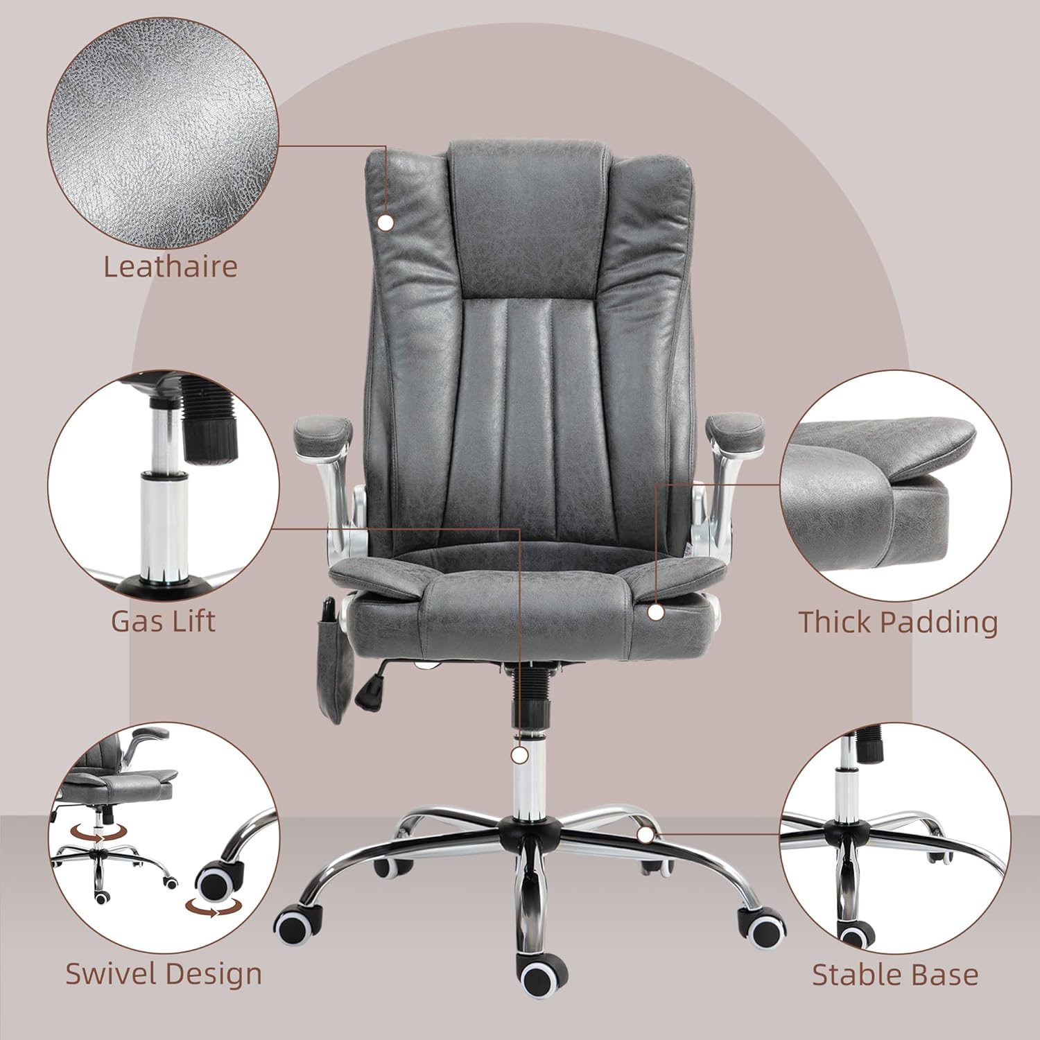 Transform your workspace into a haven of relaxation with the HOMCOM Executive Office Chair. Featuring six vibration massage points focused on your back, lumbar, and thighs with eight modes and a soothing heat function, you’ll forget you’re at work! Wrapped in easy-clean, plush leather-like fabric, this desk chair for bedroom invites both comfort and style to any home office or bedroom desk setup.