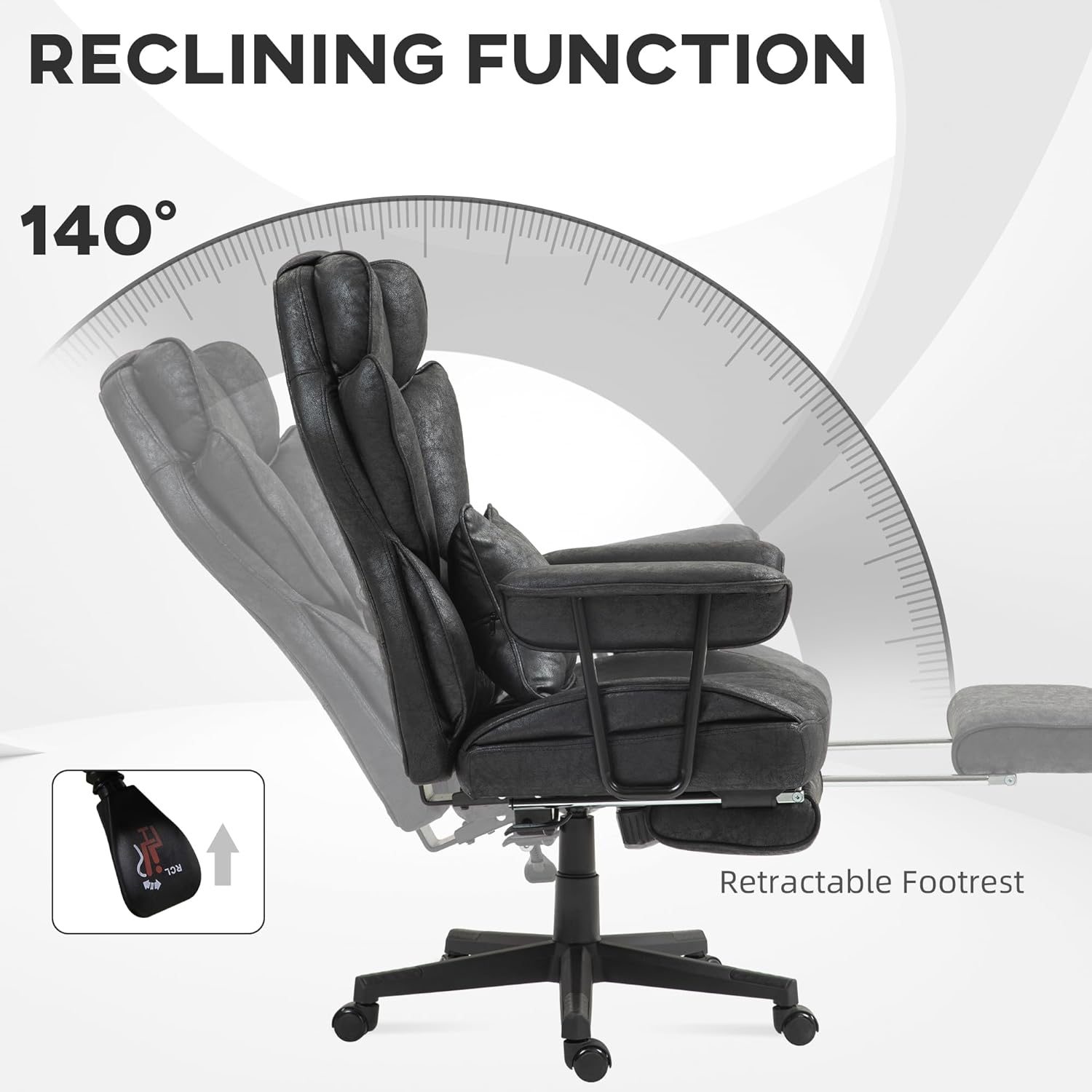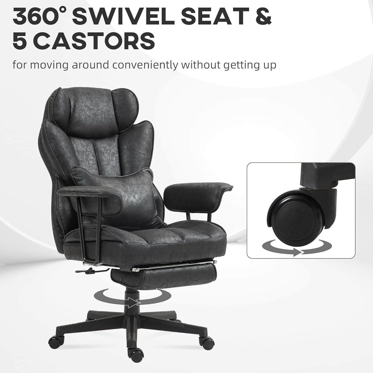 Enhanced Comfort And Support: This high-back office chair is crafted for prolonged usage, featuring a detachable lumbar pillow and a retractable footrest for extra support. It also includes a 360° swivel seat and smooth-rolling wheels, enhancing mobility around the office.