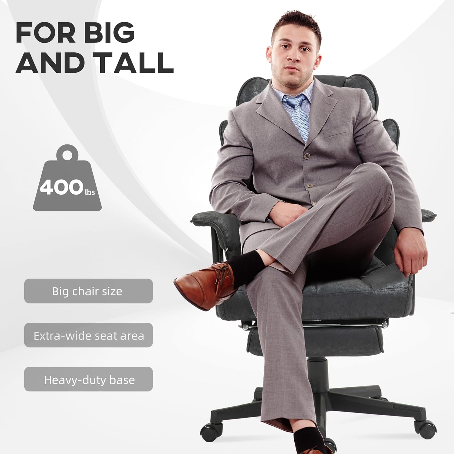 Six vibration massage points with eight modes, a timer and three-level lumbar heating, a wired remote control included Big and tall chair with a 396 lbs. weight capacity and 22.4″ wide seat 6.3″ thickened foam cushion to minimize body pain and provide lumbar support Seat height adjusts from 20.1″-23.2″ for optimal comfort 140° reclining back and a footrest 360° rotating seat and swivel wheels for mobility Skin-friendly, breathable microfiber cloth offers comfort when you’re sitting For use in offices, study rooms and meeting spaces