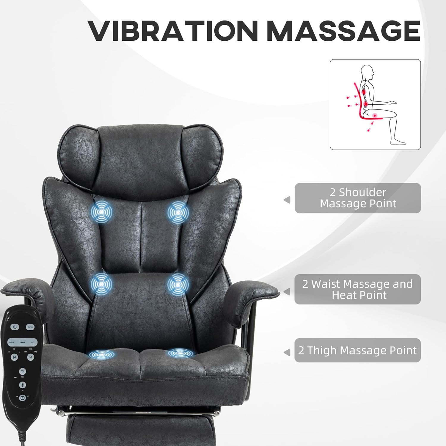 Vibration Massage And Heating Options: Enjoy unparalleled comfort with this office chair, equipped with a 6-point vibration massage system offering 8 different settings, a timer, and 3 lumbar heating levels to soothe back discomfort. Control all features effortlessly using the included remote.