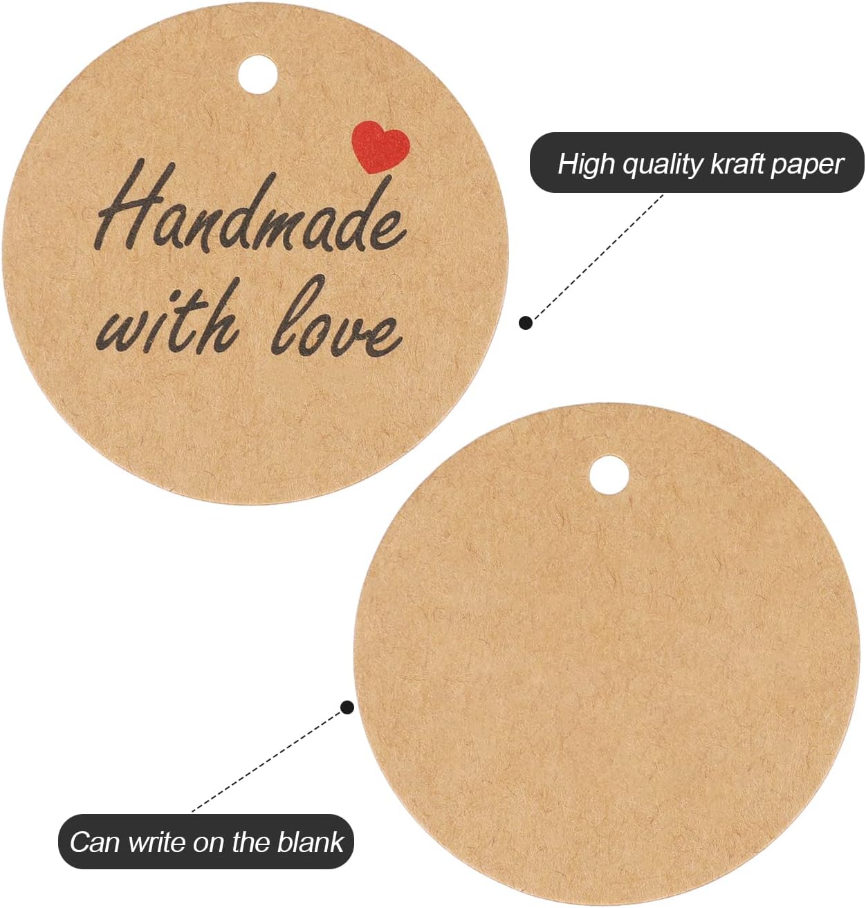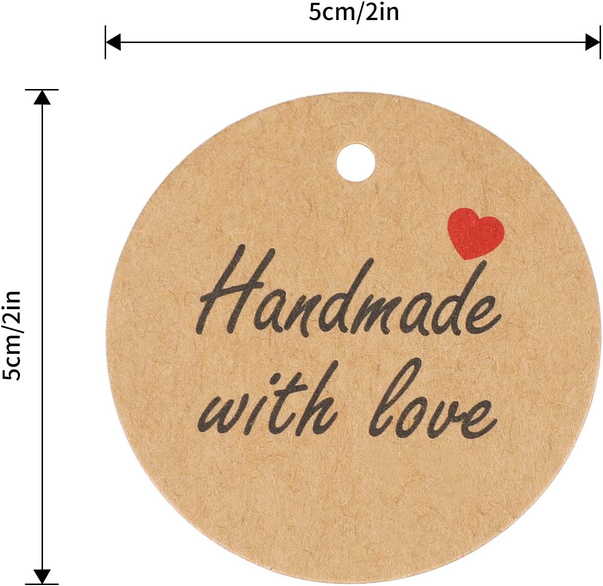 【Unique Design of Handmade with Love Tags】- The handmade tags in brown colors.One side printed with Handmade with Love classic words and a red heart pattern.Other side is blank,you can write on these paper gift tags with a pen,pencil or permanent marker.Add more happy atmosphere,can better express your emotions to your lover.