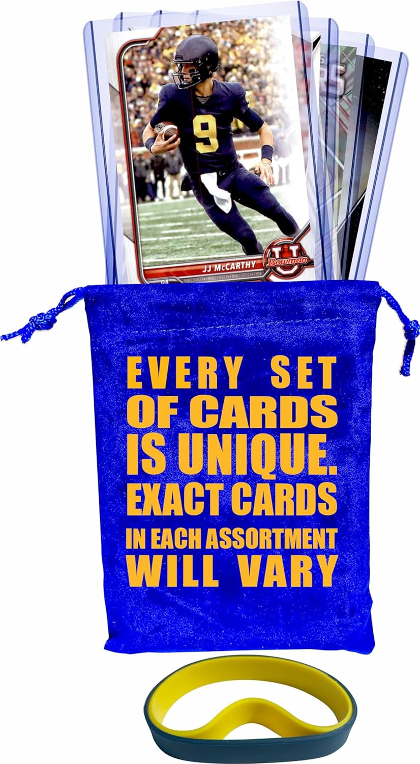 Grab this great lot of one of the new football players, JJ McCarthy! Guaranteed to contain 4 authentic, licensed football trading cards of JJ McCarthy. Exact assortment varies and could contain Michigan Wolverines college uniform. Each card comes in a protective sleeve and toploader case. The group comes in a gift bag with assorted color bracelets. Great for gift giving for collector’s young and old.