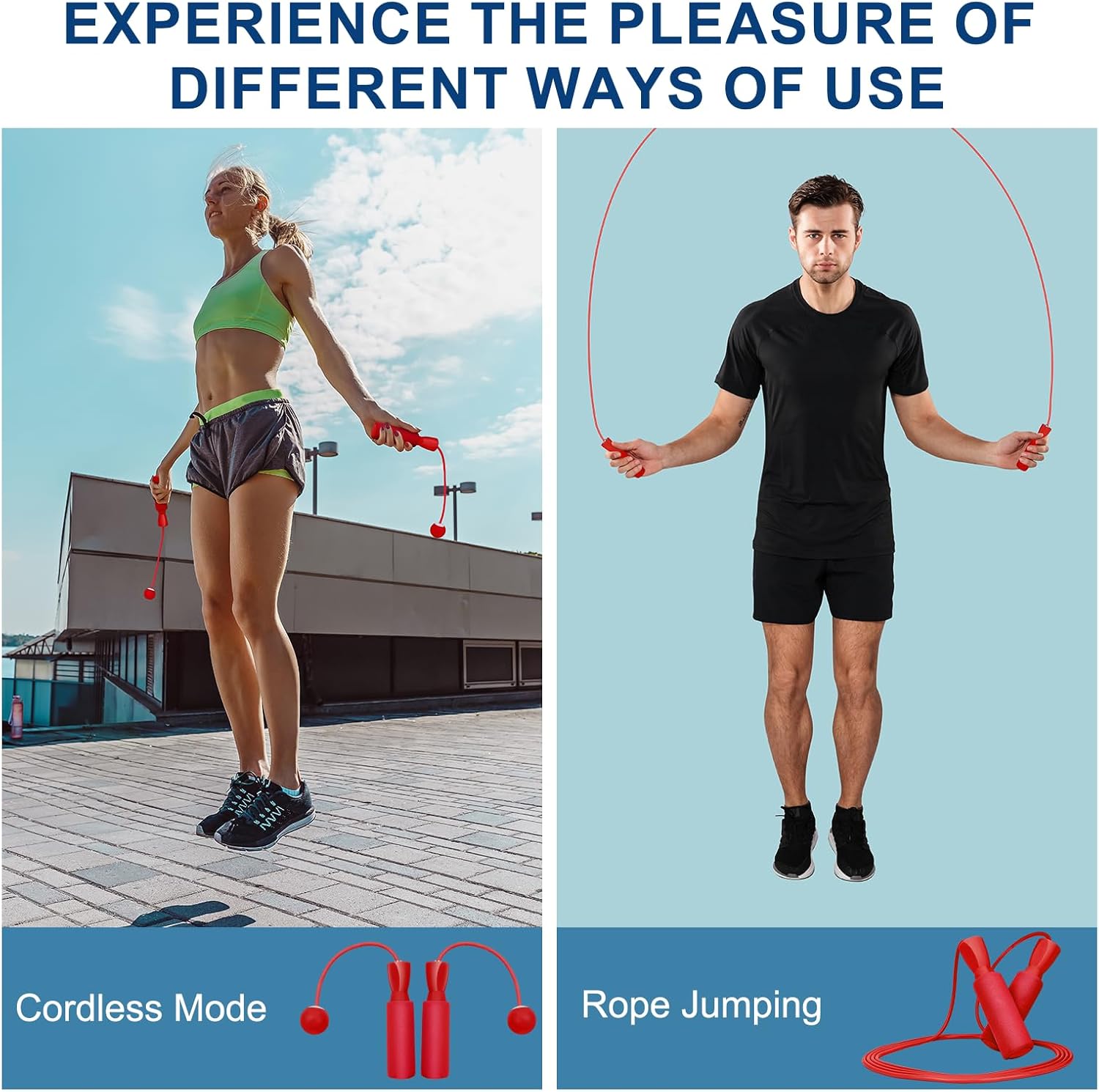 【Double Mode Jump Rope】The set contains two handles, two weighted balls and a skipping rope. The adjustable jump ropes adopt a creative design that allows you to change the mode freely between rope jump and cordless jump.