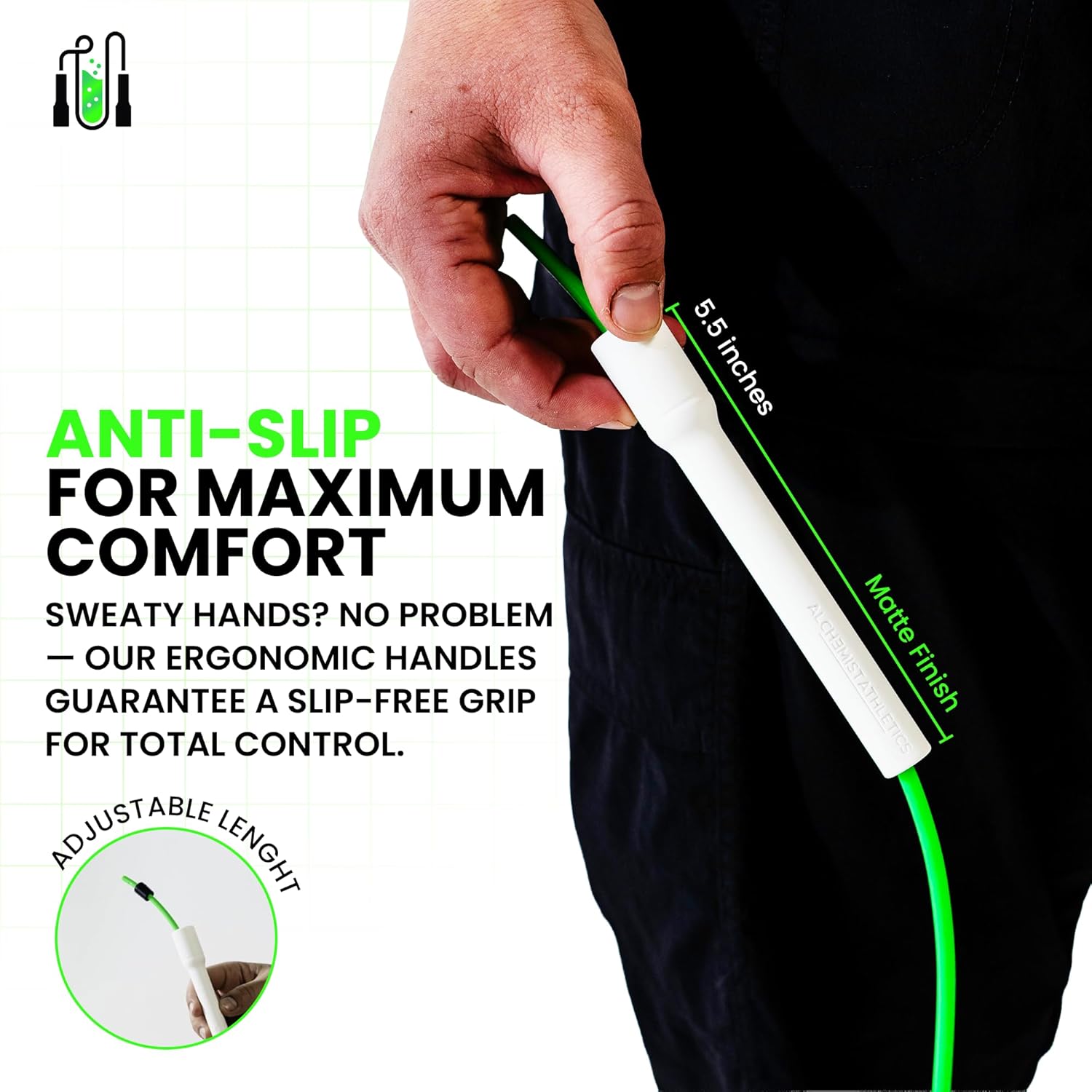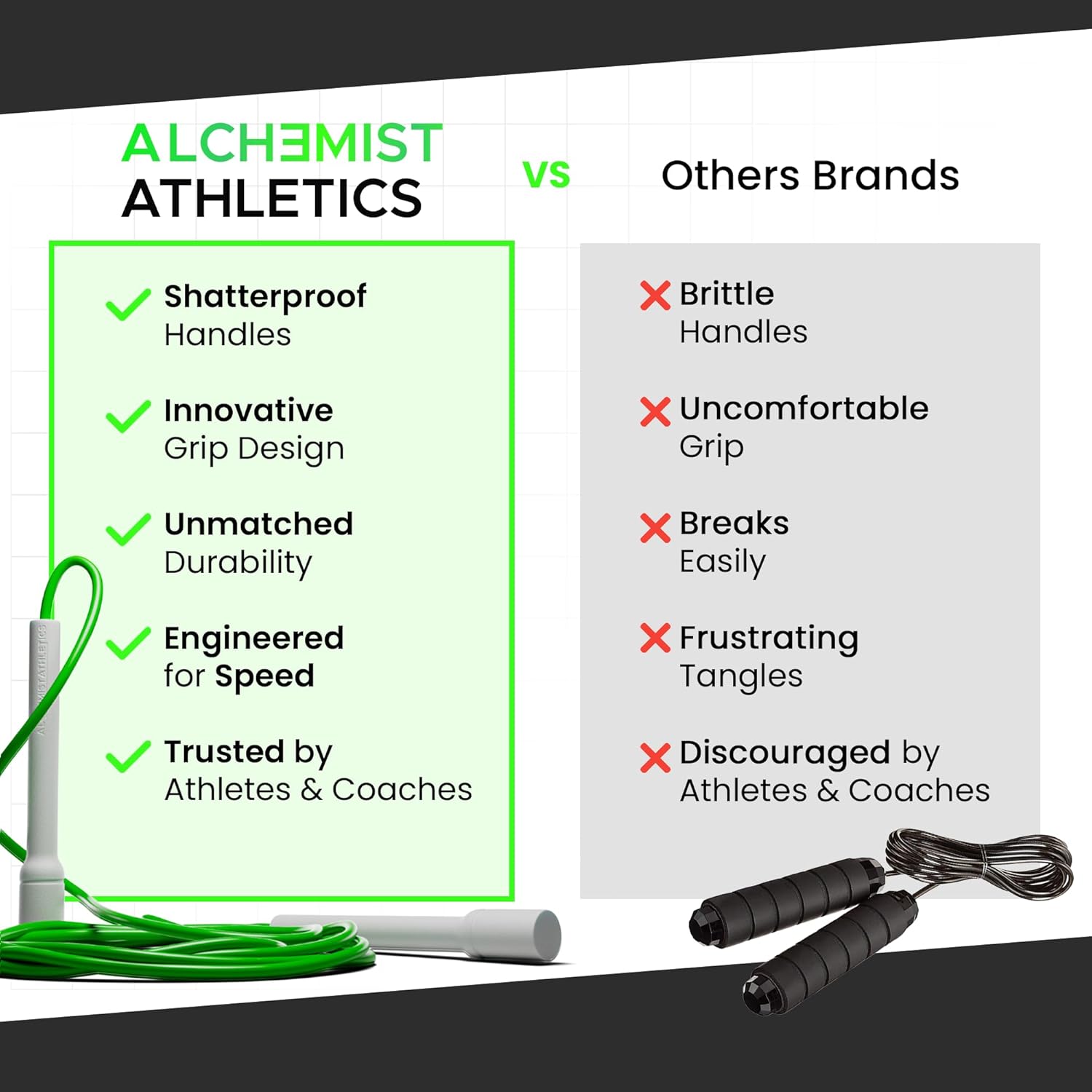 ELEVATE YOUR WORKOUTS WITH ALCHEMIST ATHLETICS V-15 JUMP ROPE Whether you’re just starting your fitness journey or you’re an experienced athlete, the Alchemist Athletics V-15 jump rope is built to perform. More than just a jump rope, it’s a powerful tool for cardio, endurance, and agility. Designed for both beginners and pros, this rope delivers precision, durability, and results in every jump. WHY CHOOSE THE V-15 JUMP ROPE? Shatterproof Ergonomic Handles – Built for high-impact training, these patented, shatterproof, anti-slip handles provide a secure grip and unmatched durability. 10ft Adjustable Length – Easily customize your rope to match your height and training style for the perfect fit. Smooth & Fast Rotations – The premium 5mm PVC cord and handle design delivers effortless speed, ideal for freestyle tricks, cardio training, and double unders. Tangle-Free, Friction-Reducing Design – No snags, no slowdowns—just seamless jumping. Built for All Skill Levels – From your very first jump to advanced freestyle moves, the V-15 adapts to your training. A JUMP ROPE DESIGNED FOR EVERY ATHLETE From home workouts to gym training, the V-15 jump rope is trusted by beginners, fitness enthusiasts, and elite athletes worldwide. Whether you’re burning calories, improving footwork, or pushing your limits, this jump rope is your go-to fitness tool. BENEFITS: Burn calories and boost cardio health Improve coordination, agility, and endurance Train anywhere—indoors or outdoors Engineered for durability with no snags, no breaks, and long-lasting performance Upgrade your workouts with the Alchemist Athletics V-15 Jump Rope — the ultimate tool for speed, precision, and transformation. Take your training to the next level today.