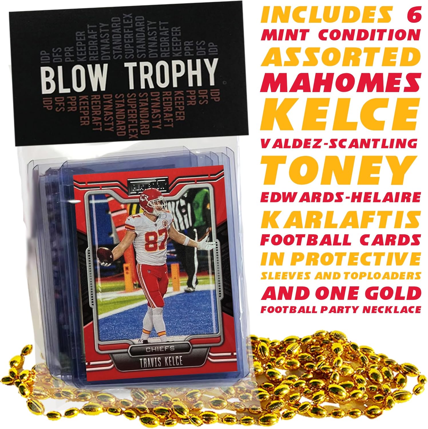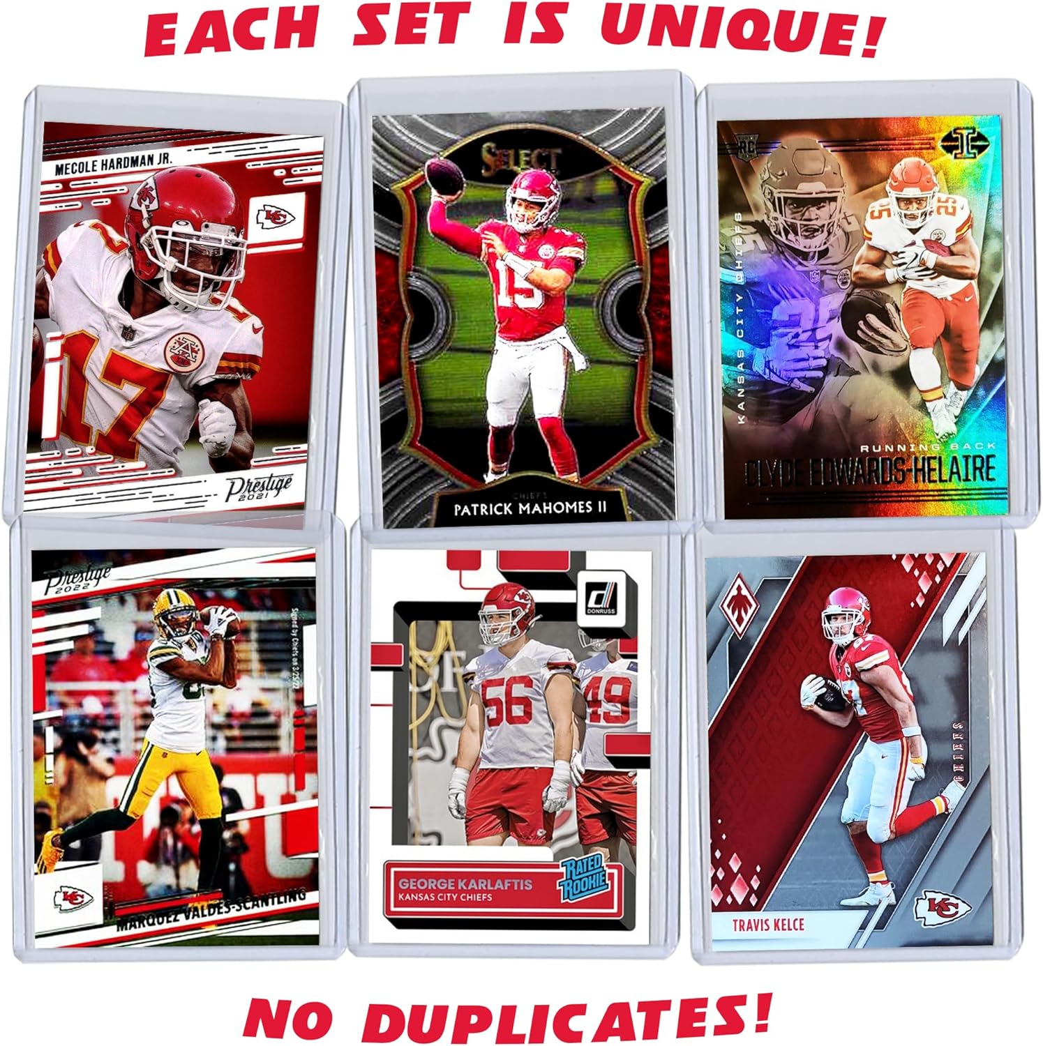 Kansas City Chiefs Super Bowl LVIII Football Card Bundle, Set of 6 Assorted Patrick Mahomes Travis Kelce George Karlaftis Marquez Valdes Scantling Football Cards Protected by Sleeve and Toploader