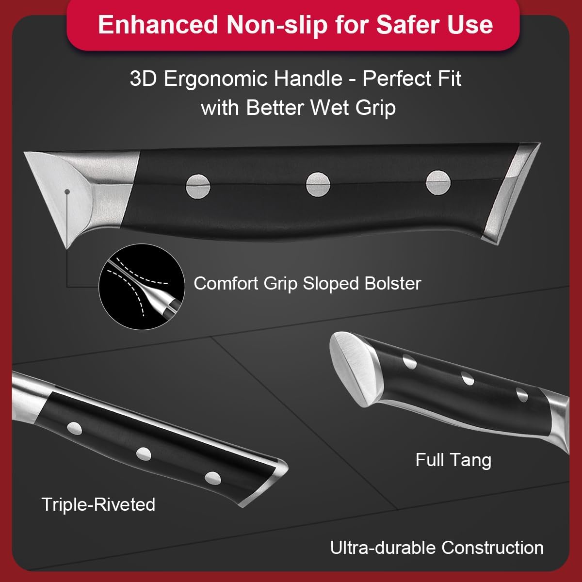 【Professional Cutting Performance】 Zongchuan knife set with block and sharpener delivers exceptional sharpness, lasting durability, and effortless cutting through its advanced multi-stage blade technology, which integrates: Precision Straight-Edge Grinding – Razor-sharp edges for fast, clean cuts. Extended Blade Geometry – Enhanced stability for detailed tasks. Convex Grind & Food Release – Reduced adhesion for smooth slicing.