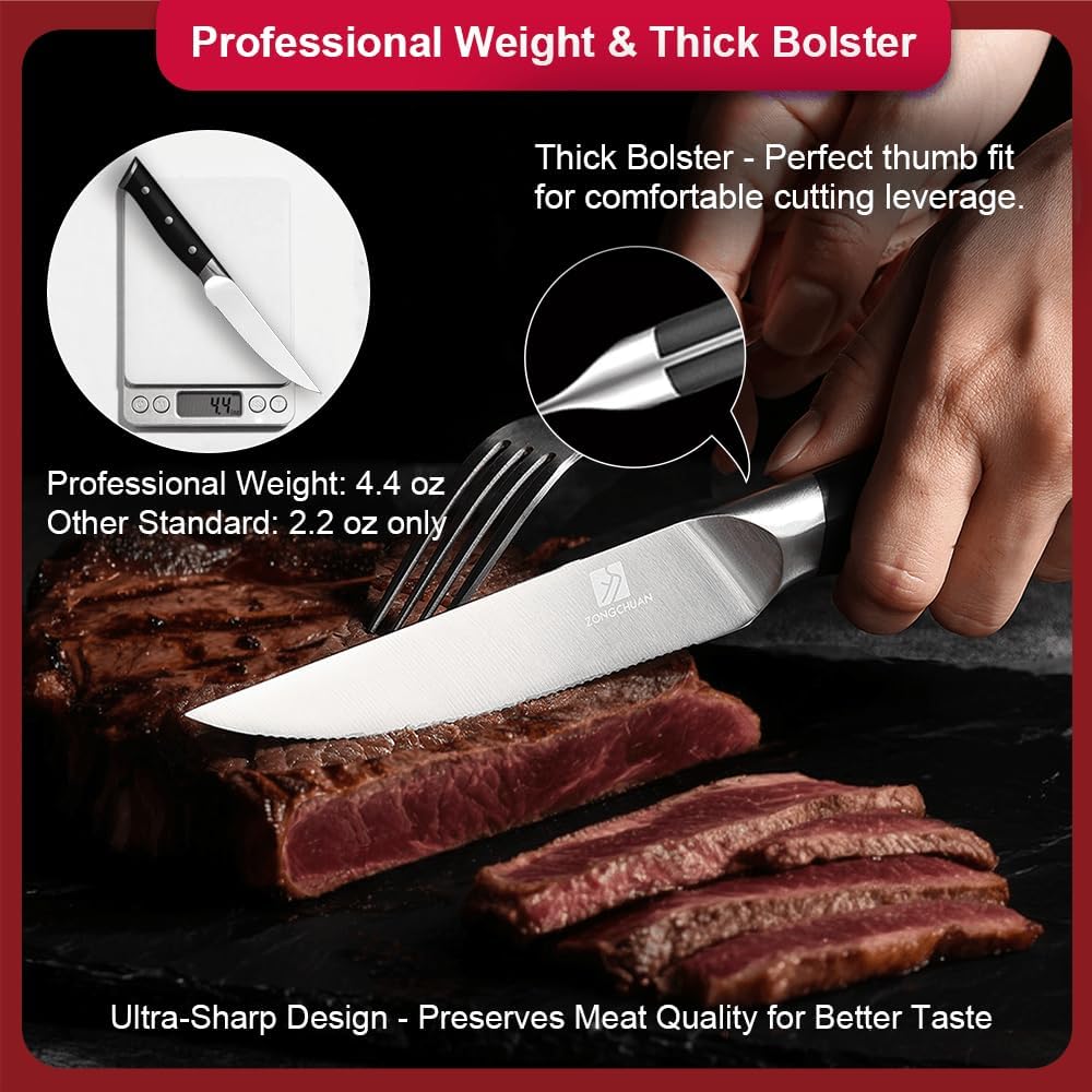 【Triple-Tech Design for Precision Cutting】These steak knives pair perfectly with our knife set with block, delivering effortless slicing. The left Micro-Cutting Point serrated edge (0.2mm) penetrates tough surfaces, reducing resistance. Honeycomb micro grooves (Glide Tech) on the right minimize juice adhesion and tearing. The precision-weighted handle (Balanced Core) shifts the center of gravity toward your hand, maintaining an optimal 25° cutting angle to prevent slipping. High-performance serrated steak knives for enhanced dining.