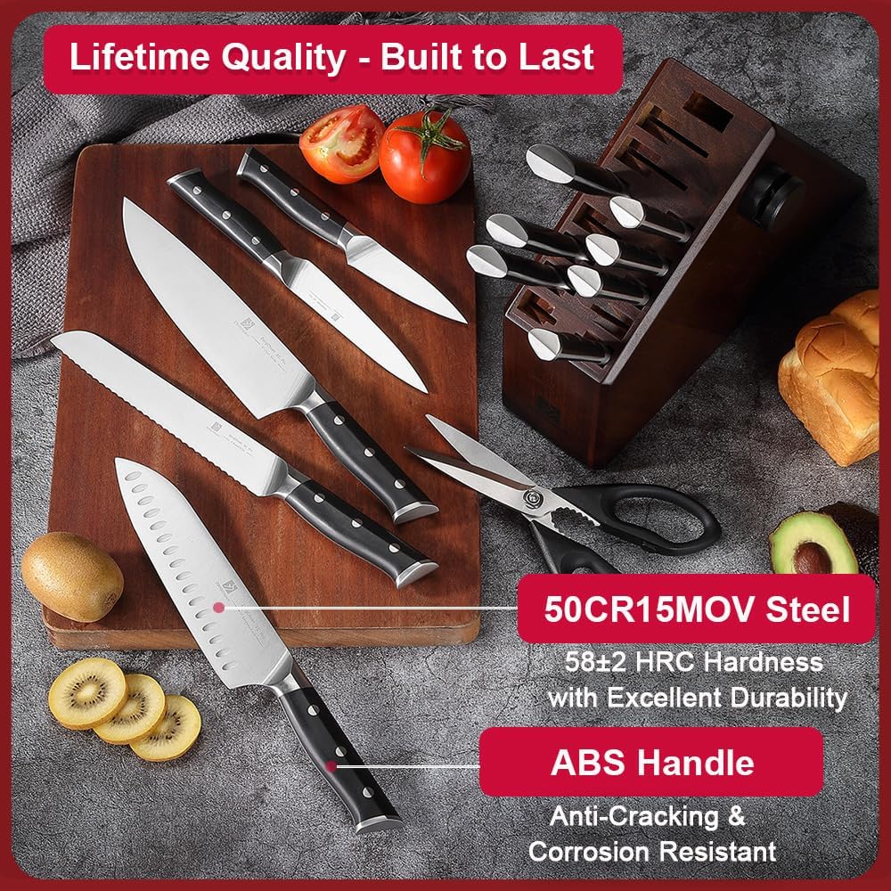 【Professional-Grade Quality】with the Zongchuan kitchen knives set,You can enjoy a lasting cutting experience.Crafted from high-quality All-around performance 50Cr15Mov stainless steel, these knives are durable, rust-resistant, and maintain a sharp edge,ensures minimal maintenance and reduces the need for frequent sharpening.The perfect collection for any cooking enthusiast. Includes lifetime quality assurance.