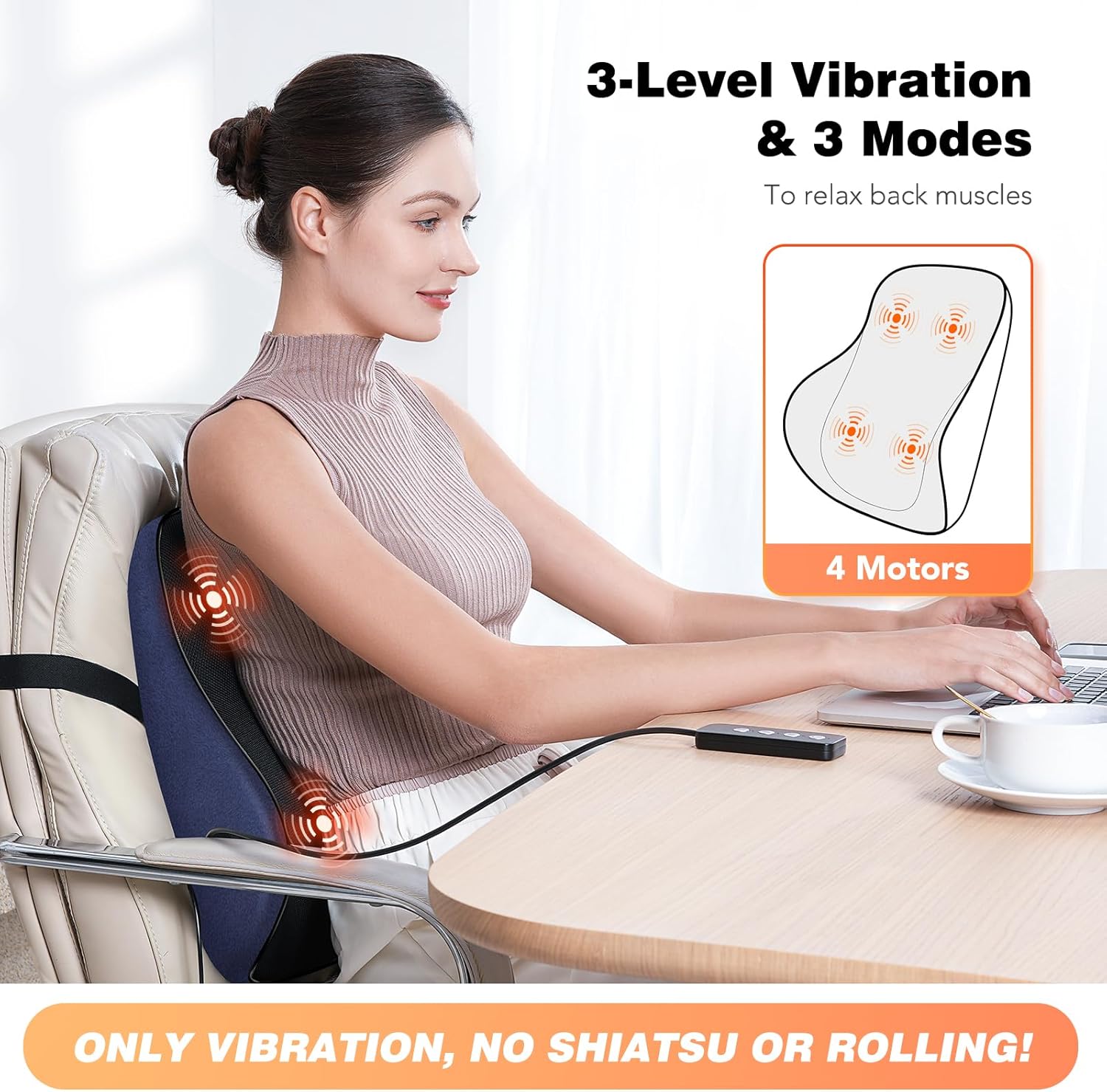 Vibration Massage: Our back support pillow is designed with 4 powerful vibration motors, providing targeted pain relief to your lower back and upper back area. 3 modes and 3 intensity levels to customize your use. Note: No rotating or rolling massage.