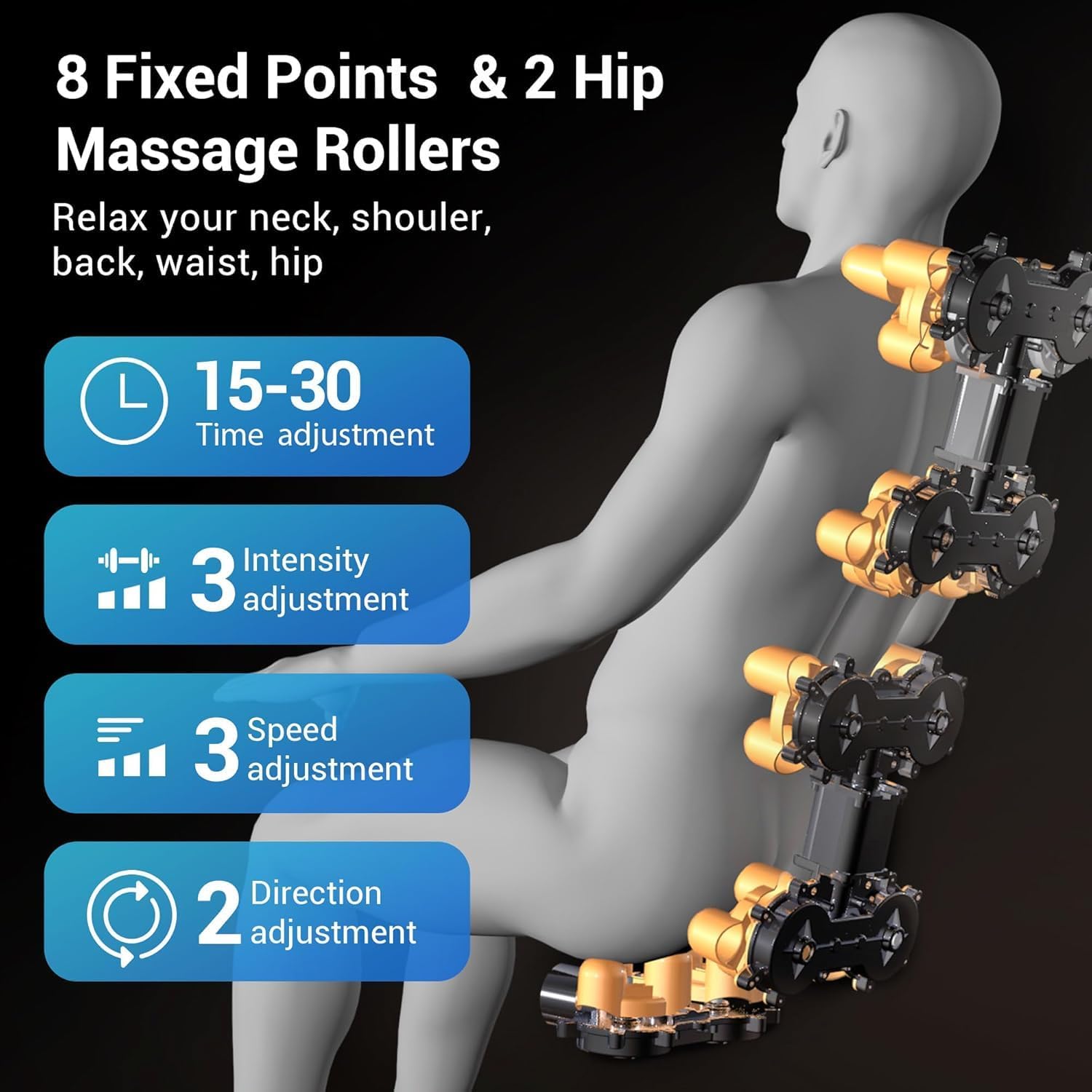 【More Massage Rollers】 Our massage chair features 10 fixed wheels and 32 massage balls, providing massage from the neck to the thighs.